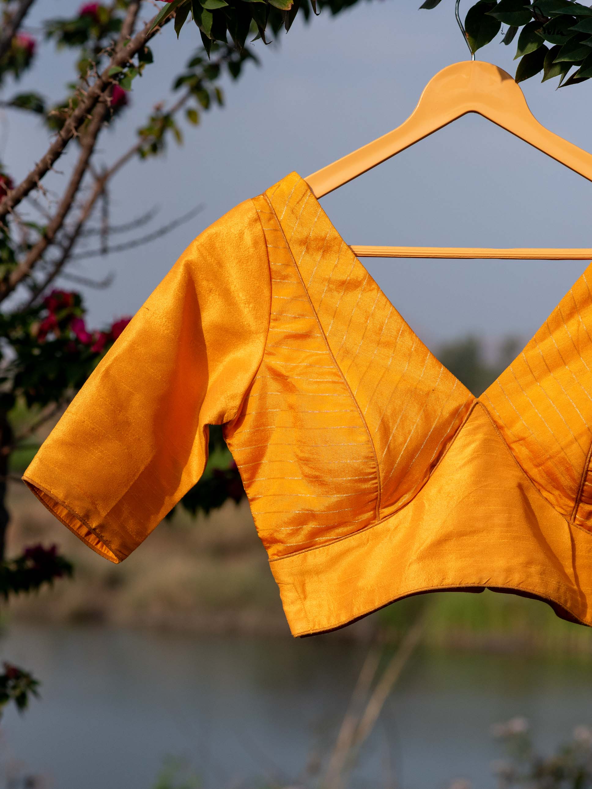 Welcome the sunshine into your wardrobe with our 'Banana Blast' blouse. Crafted from luxurious cotton silk, this yellow beauty features a quirky V-neck design, elbow sleeves, and a comforting back button opening. Drawing inspiration from the beautiful, sunny spring mornings, this blouse revitalizes your fashion with its blooming aura, spreading joy and warmth wherever you go.