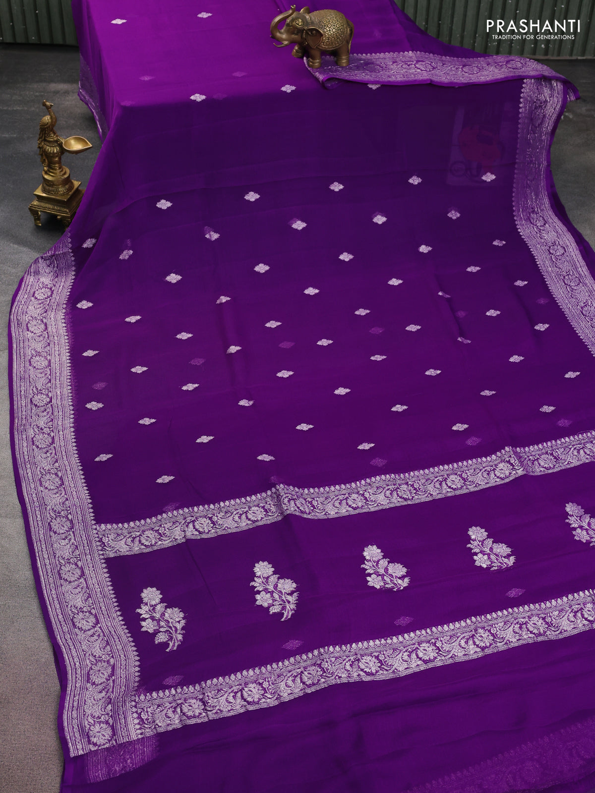 Banarasi chiffon silk saree purple with silver zari woven buttas and floral silver zari woven border