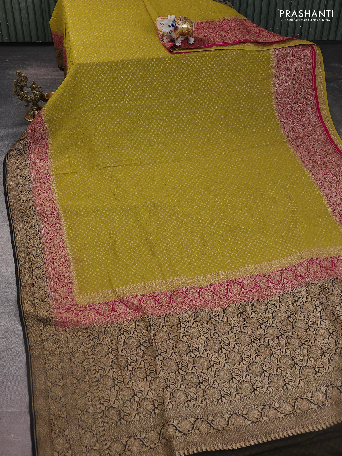 Banarasi georgette saree lime green and pink black with allover woven buttas and woven border