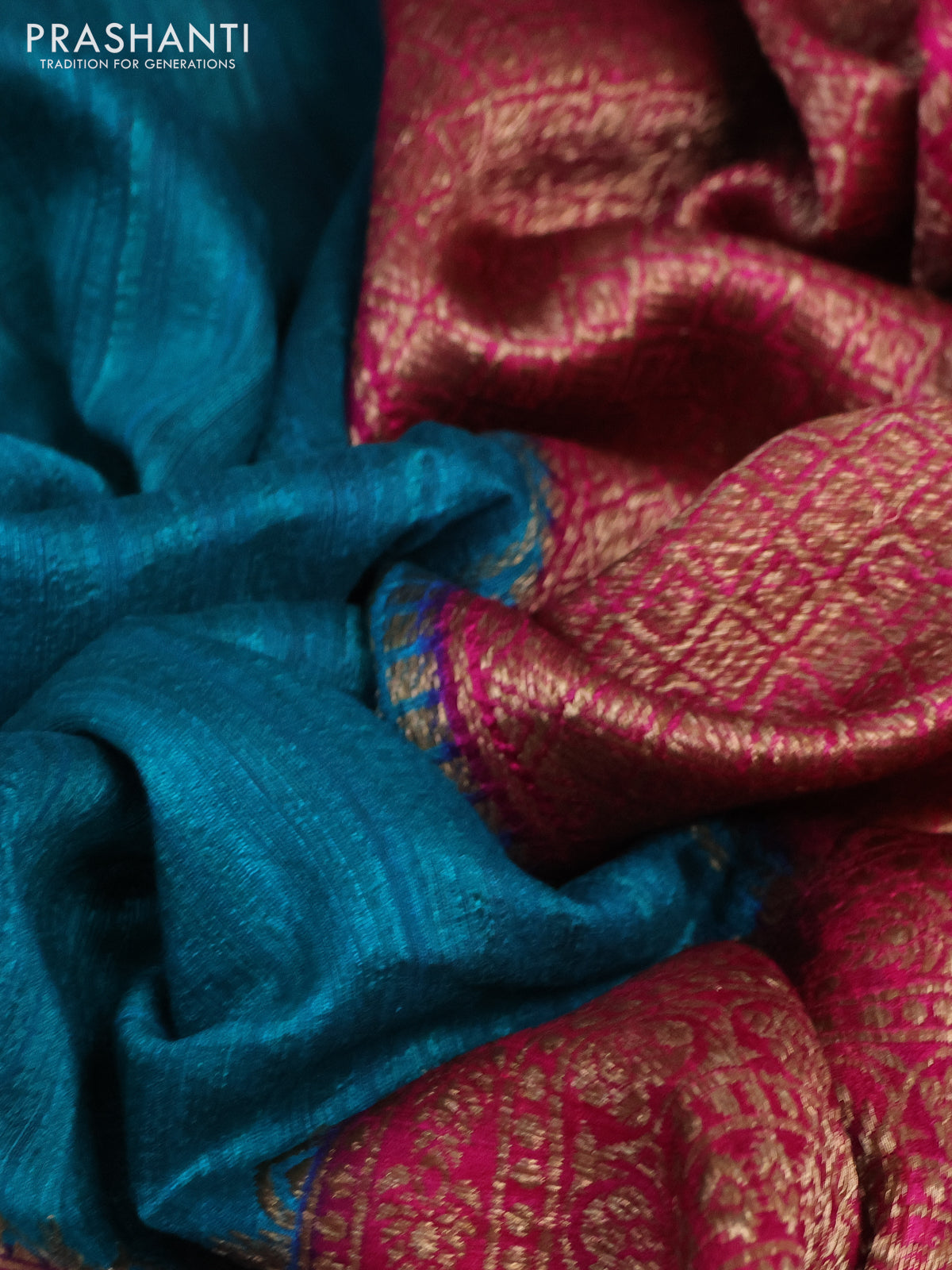 Banarasi raw silk saree teal bluish green and pink with plain body and long zari woven border