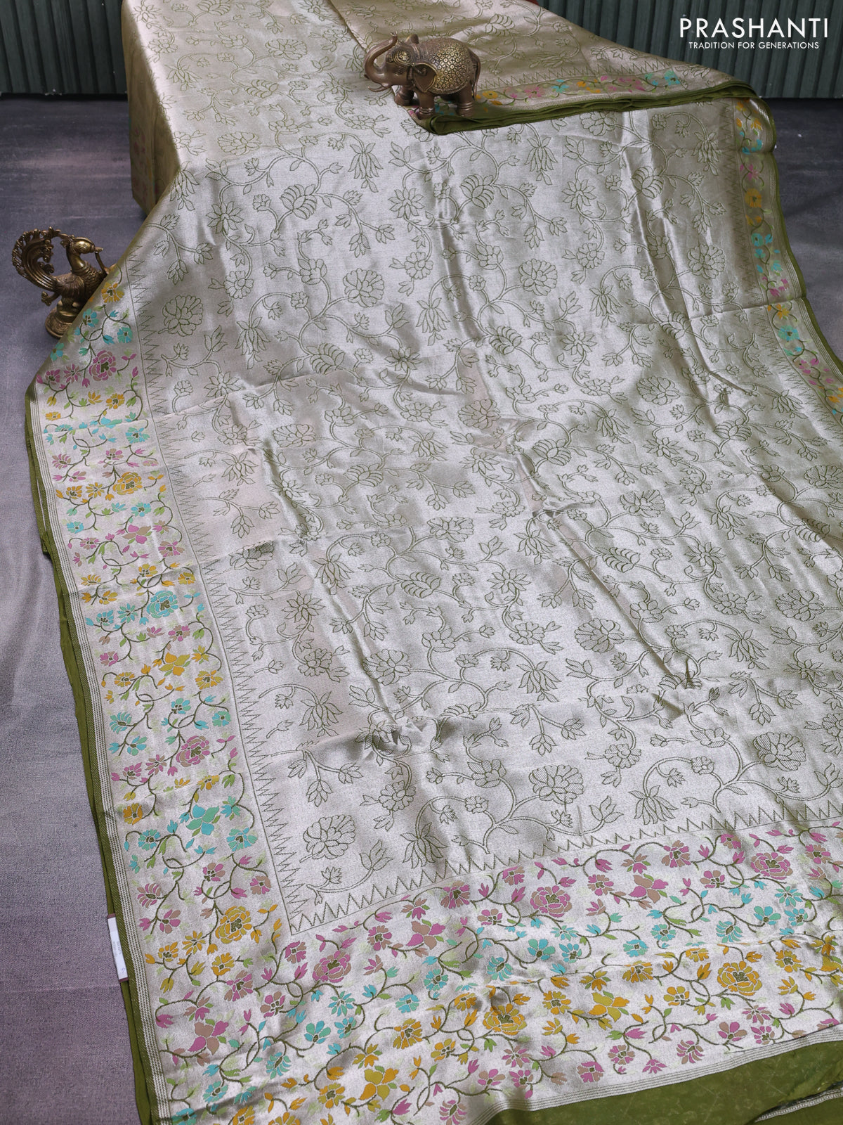 Banarasi semi raw silk saree mehendi green with allover silver zari woven floral weaves and floral design paithani border