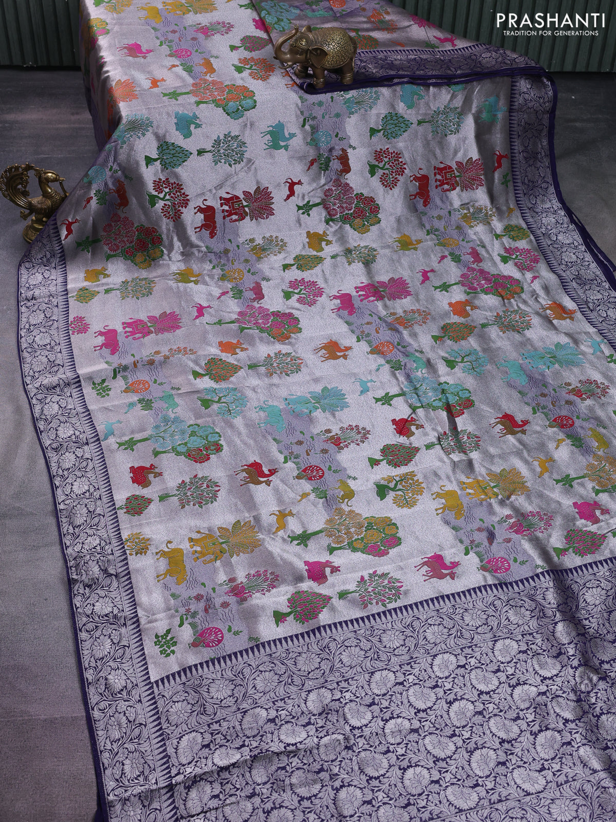 Banarasi semi raw silk saree navy blue with allover silver zari woven paithani weaves and woven border