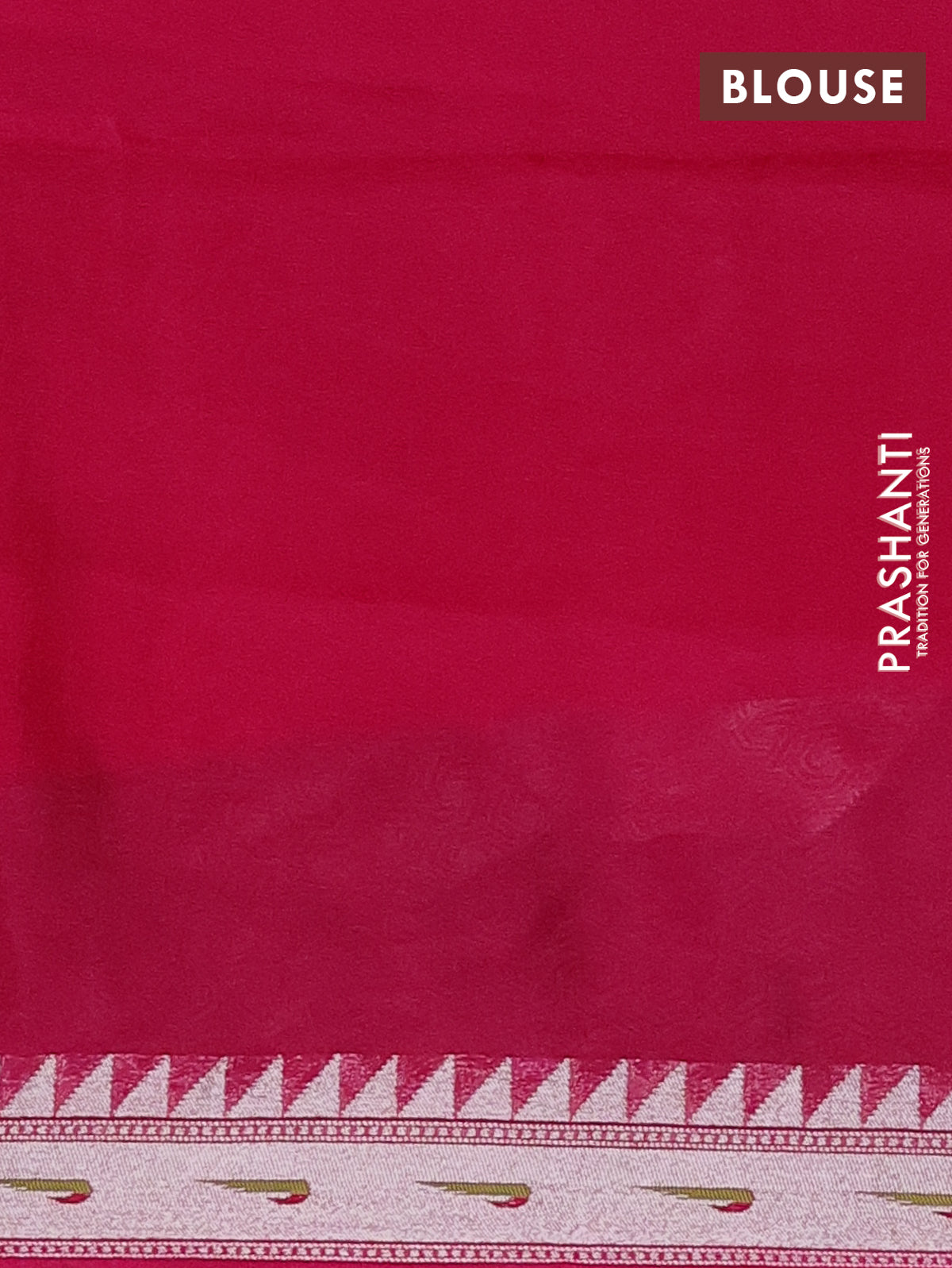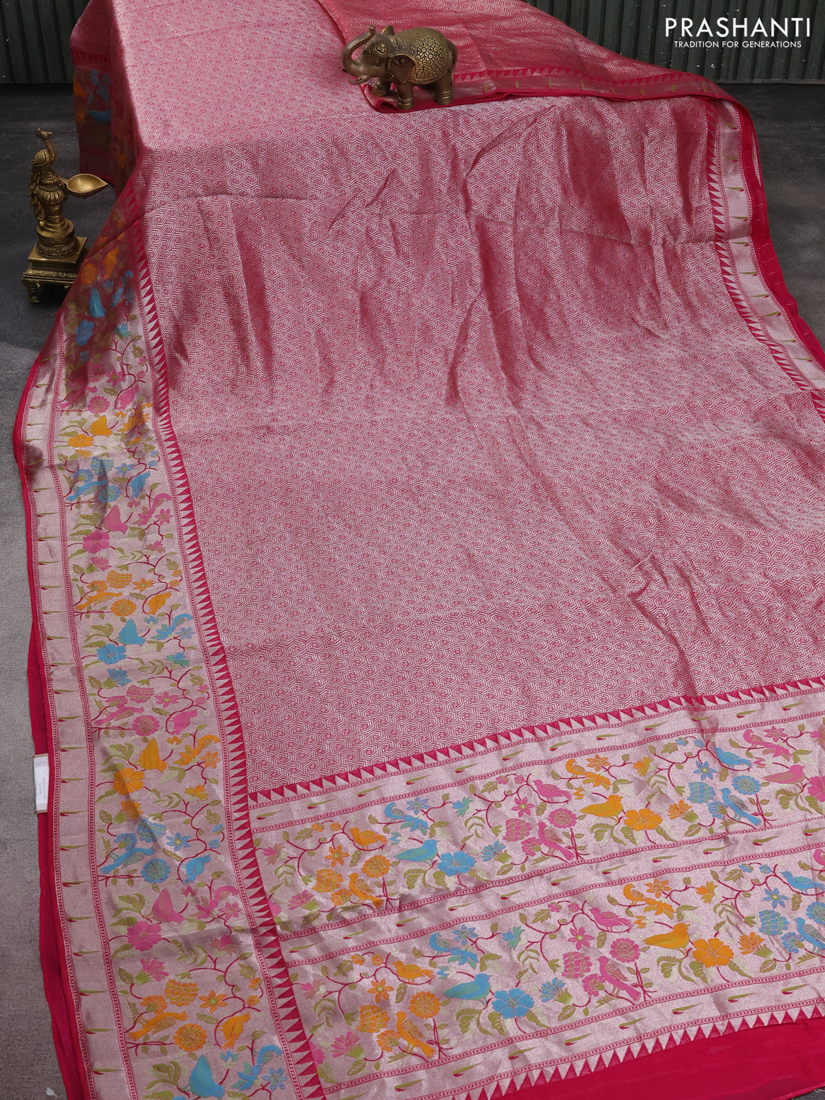 Banarasi semi raw silk saree pink with allover silver woven brocade weaves and floral design paithani border