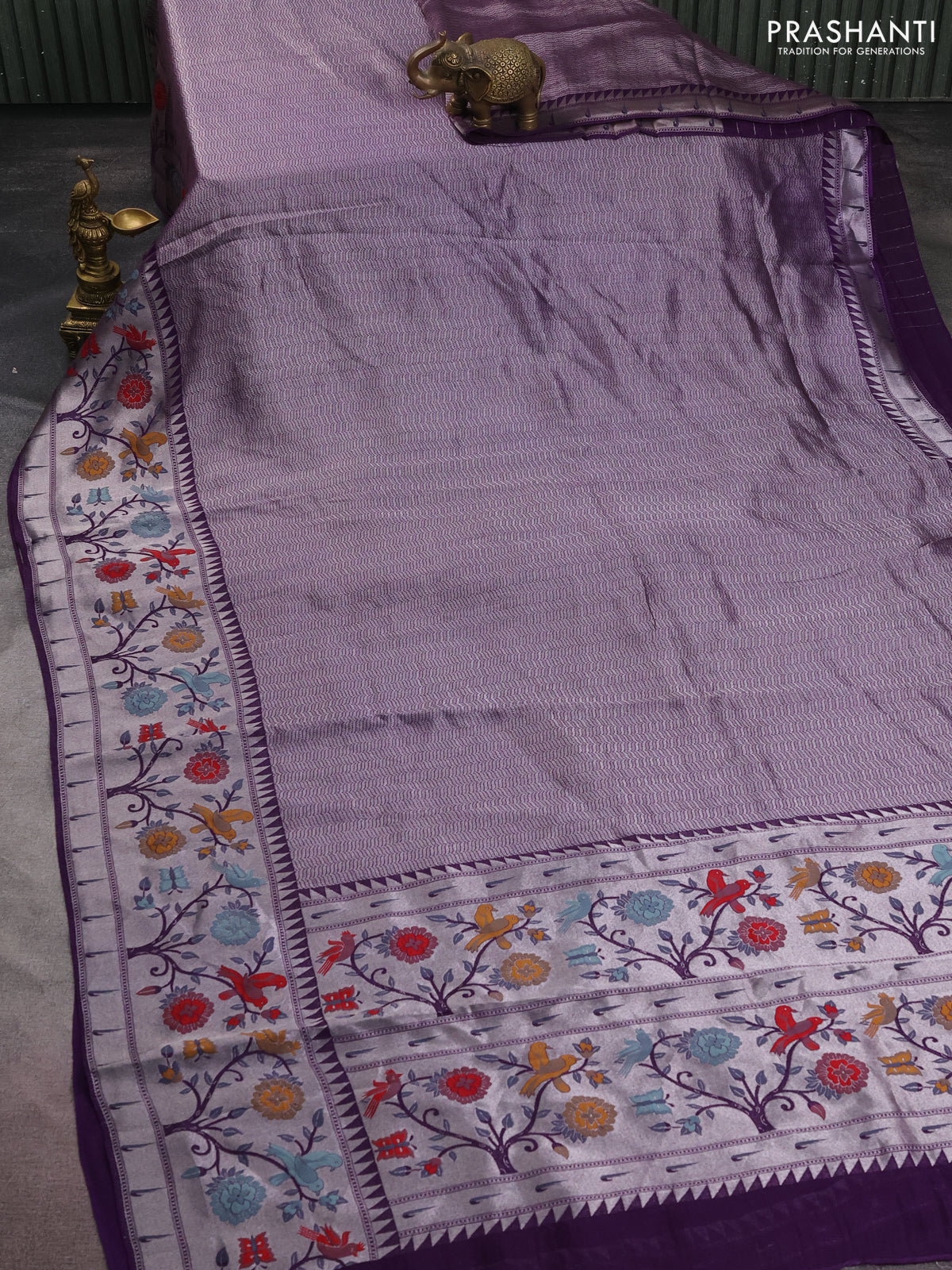 Banarasi semi raw silk saree violet with allover zari woven brocade weaves and floral design paithani border