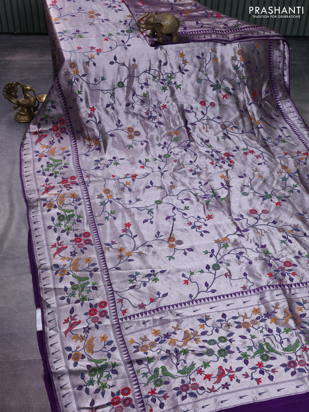 Banarasi semi raw silk saree violet with allover zari woven paithani weaves and floral design paithani border