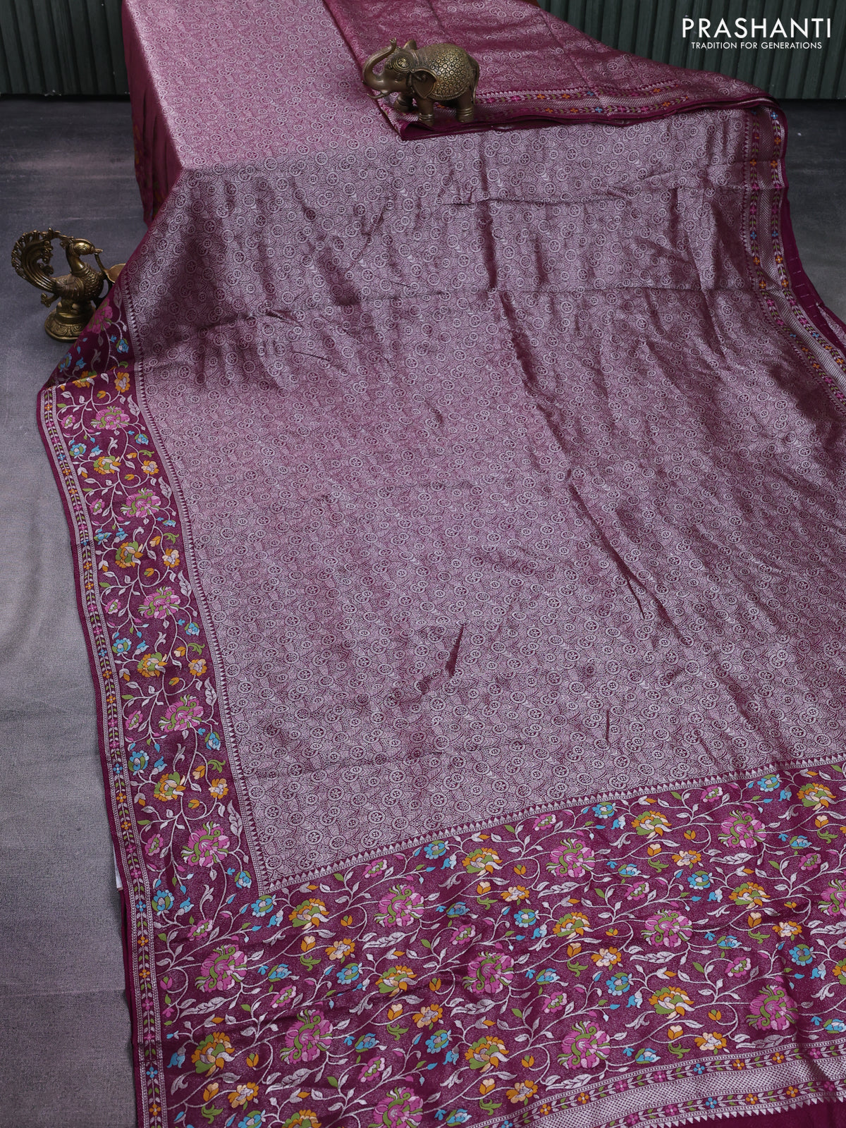 Banarasi semi raw silk saree wine shade with allover silver zari woven brocade weaves and floral design paithani border