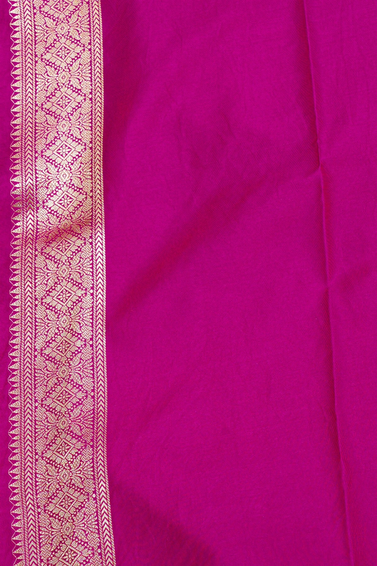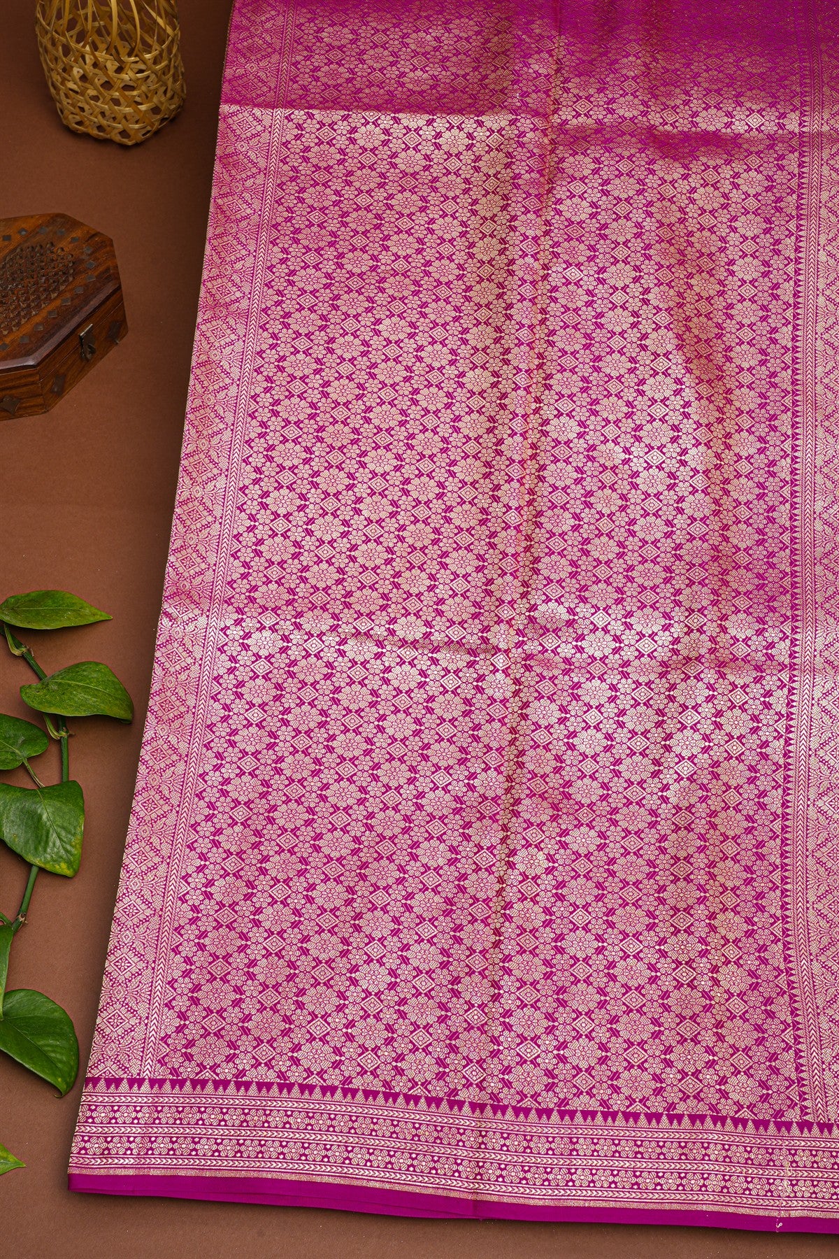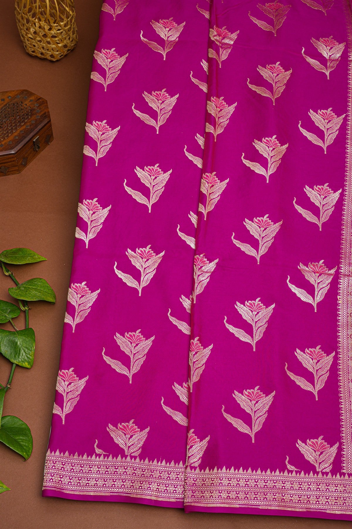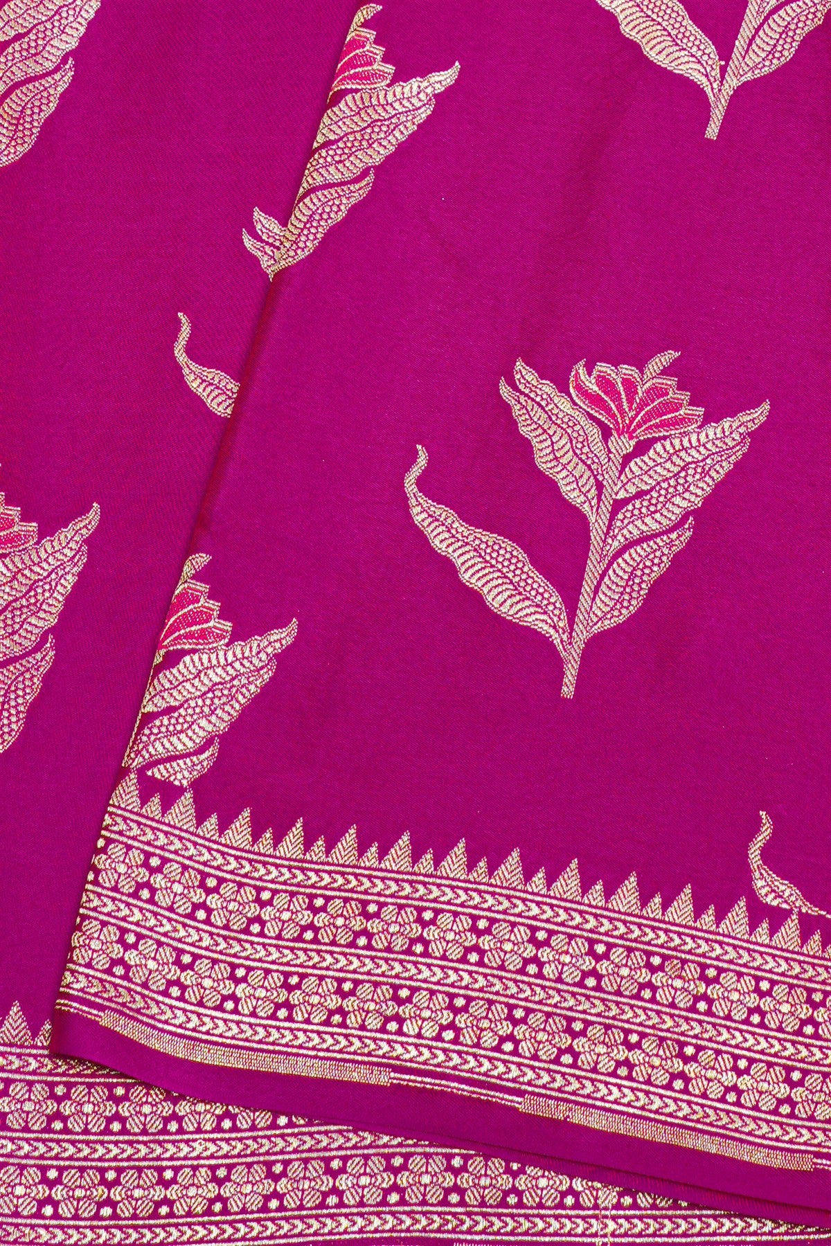 This Banarasi Silk Pink Saree is an ode to the goddess in you. Adorned with florals and leaves with gold and silver zari framed in a self border embellished with floral buttis, this saree boasts exquisite craftsmanship. Concluding the enchanting ensemble, the brocade pallu and the self with border blouse adds a touch of traditional grace.