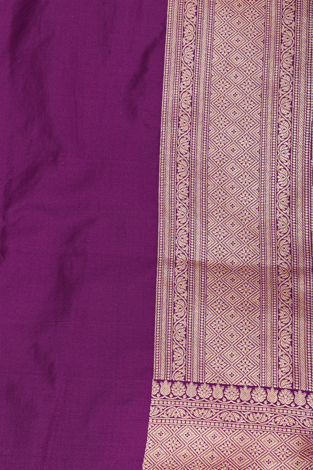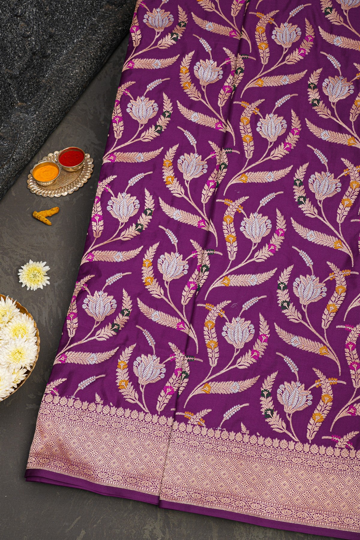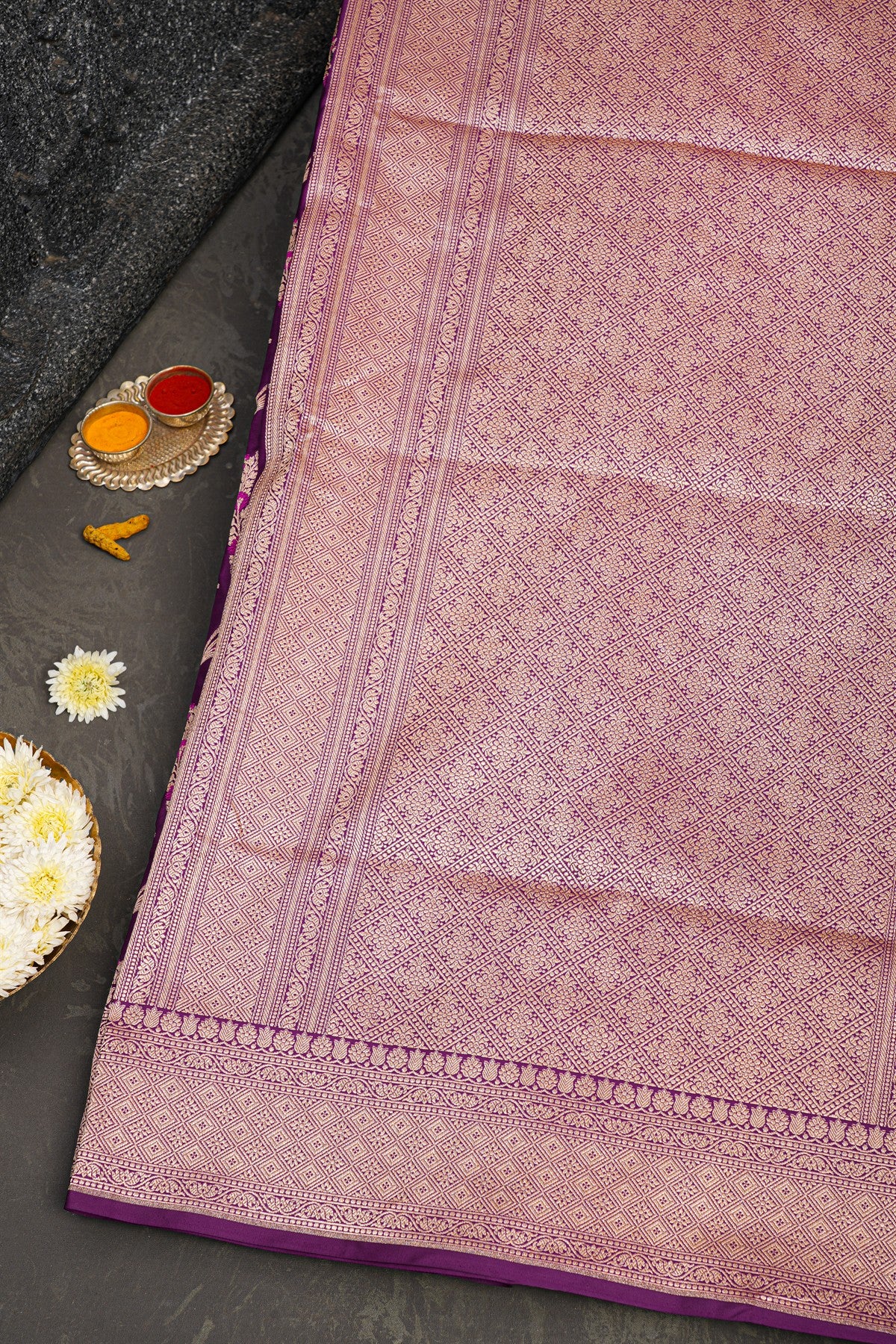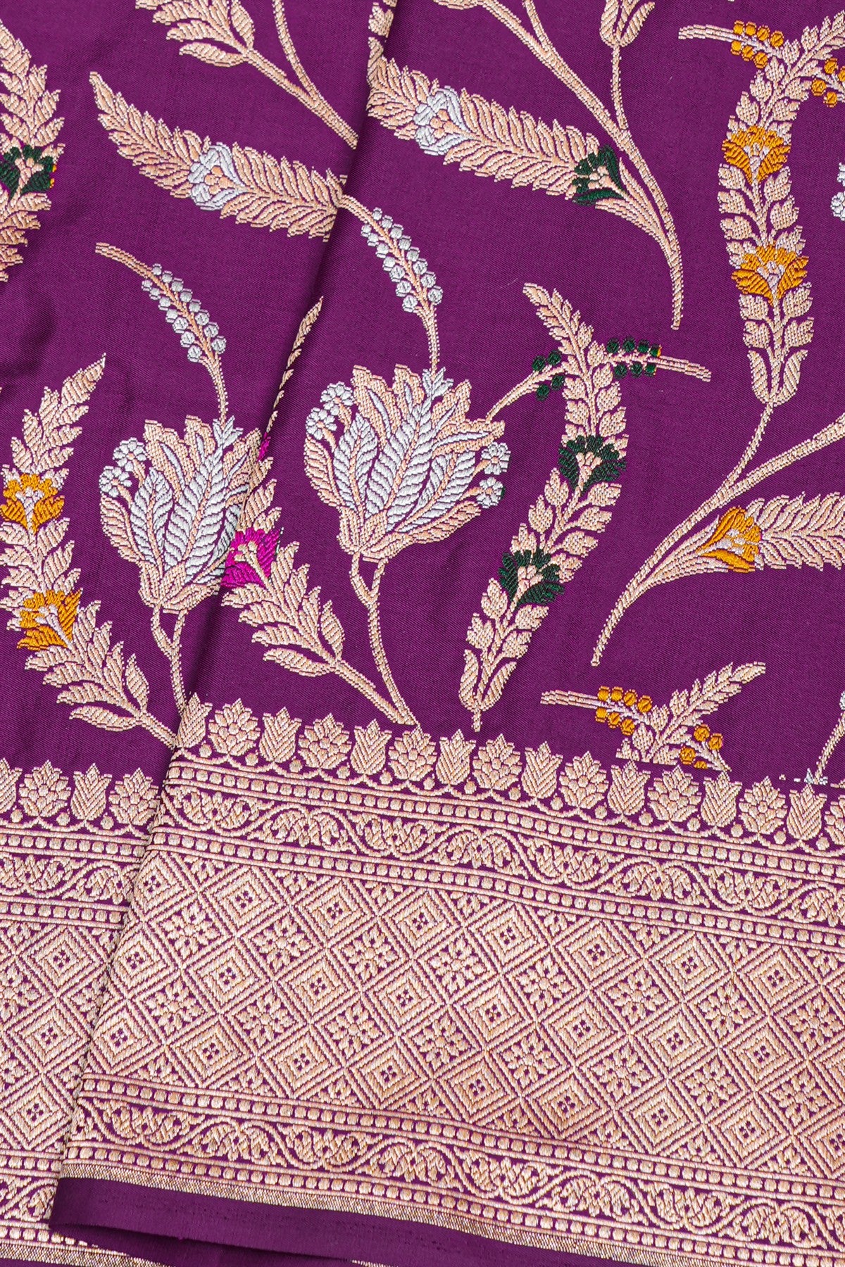 Adorn our Banarasi Silk Purple Saree and illuminate like the precious pearl. The exuberant saree is meticulously designed in florals in zari, while the self design border adorned with florals and diamonds echoes cultural heritage. The brocade pallu perfectly complements the self with border blouse, perfect to grace your special day.