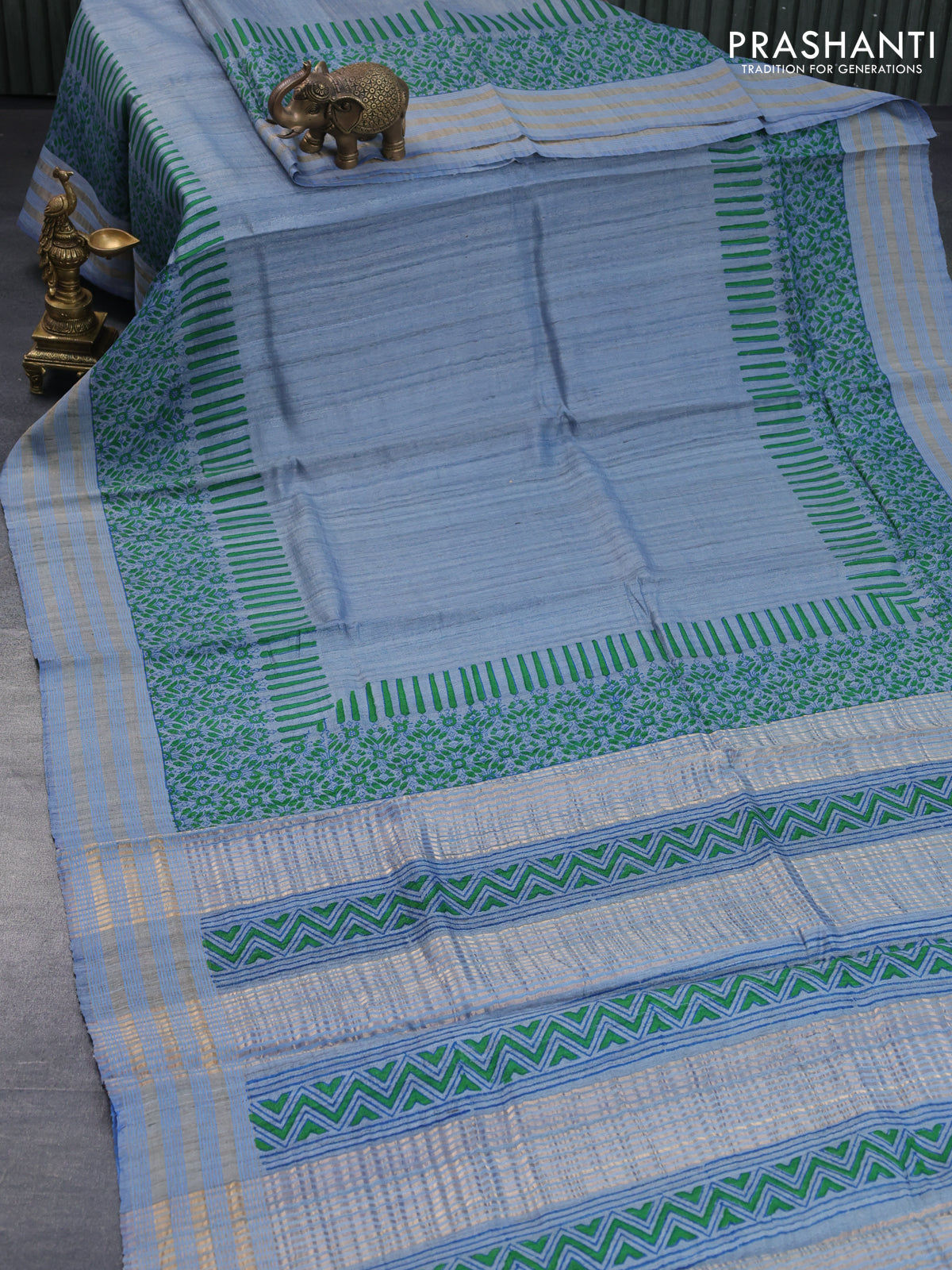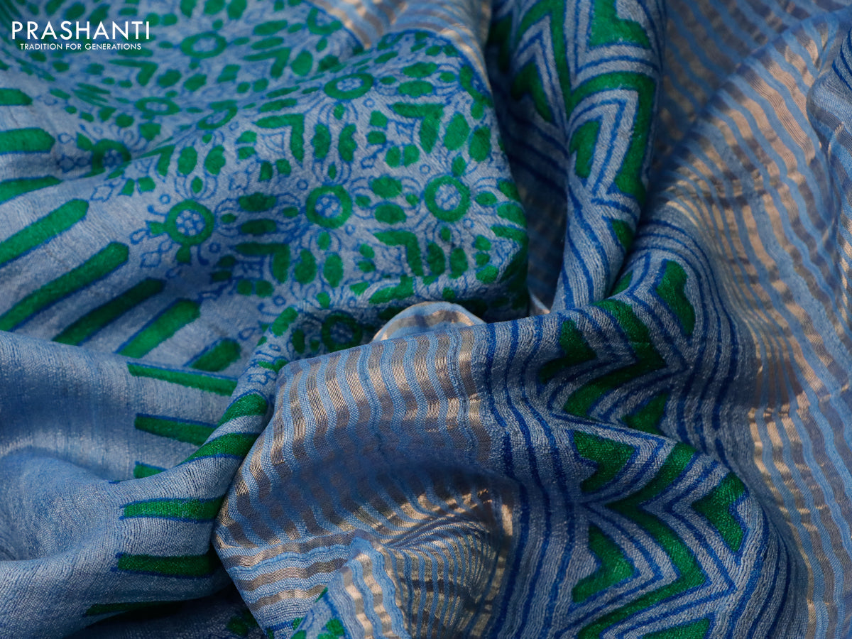 Banarasi tussar silk saree blue shade with plain body and printed pallu