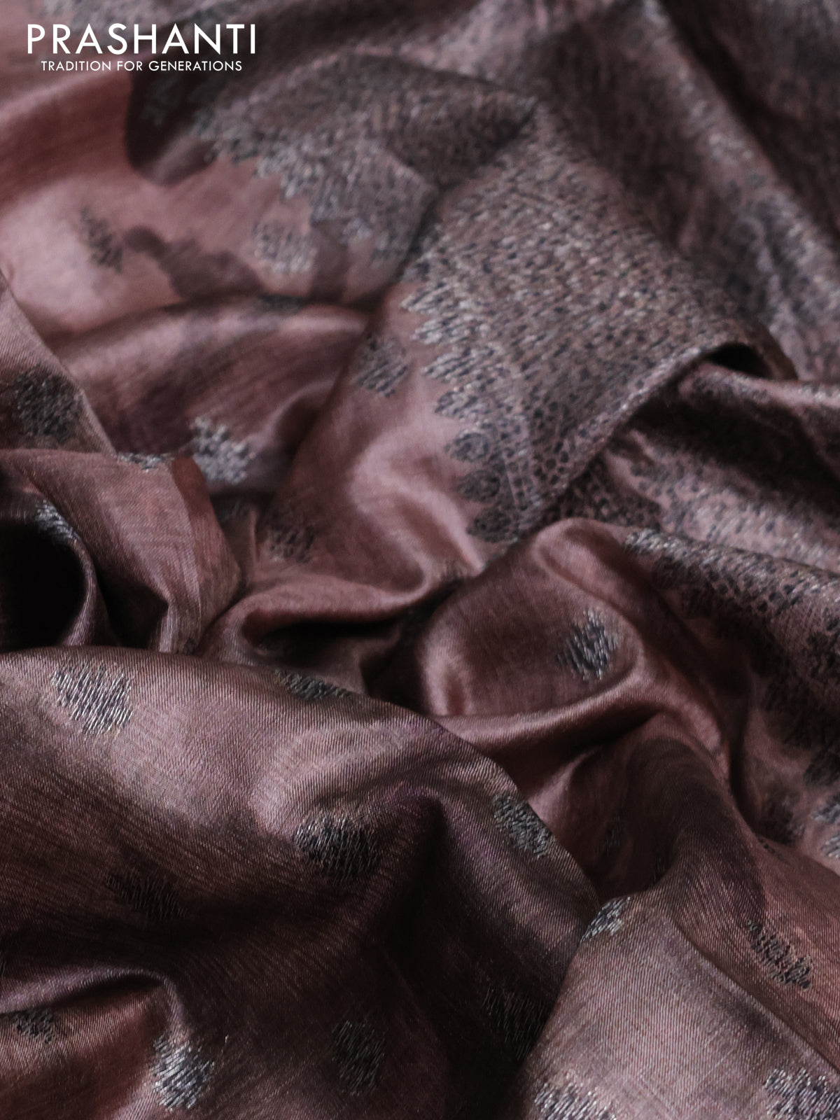 Banarasi tussar silk saree brown shade with woven buttas & digital prints in borderless style