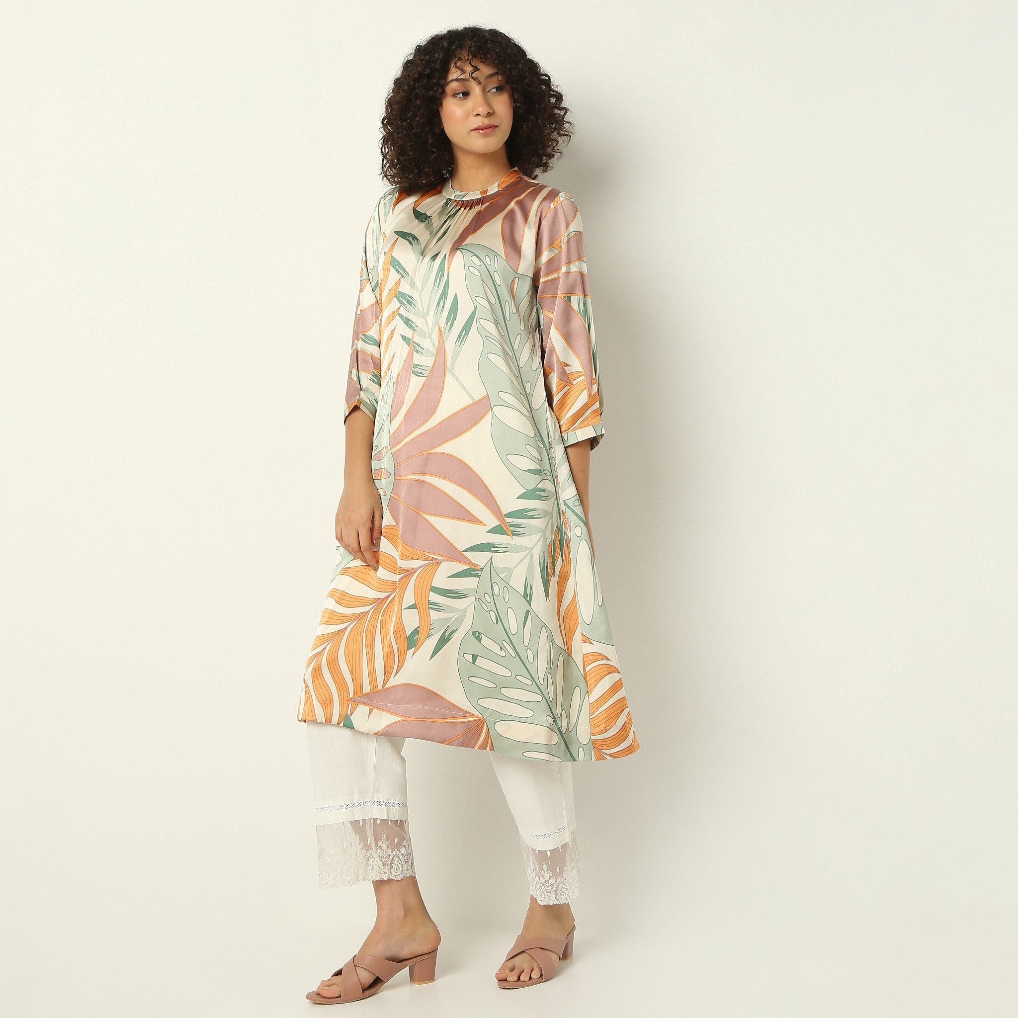 Band Collar Below Knee Three-Fourth Sleeve Flare Fit Printed Kurta
