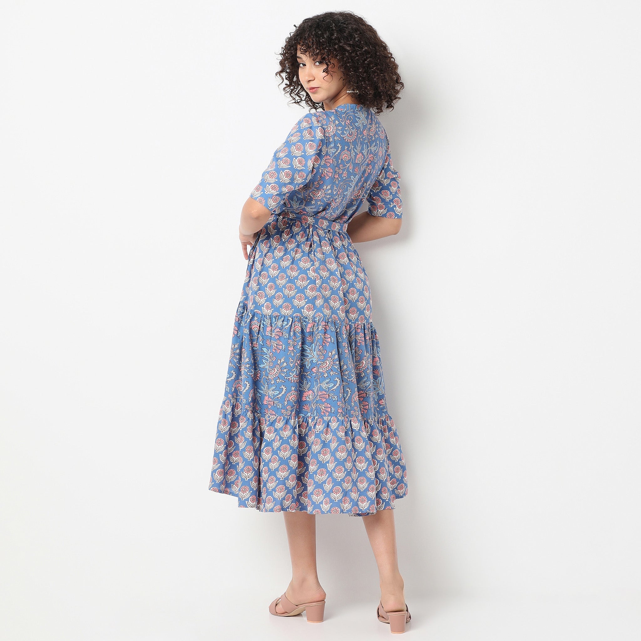 Band Collar Calf Length Elbow Sleeve Flare Fit Printed Tiered Dress