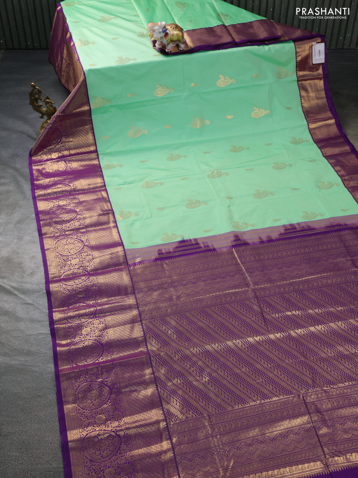 Bangalori silk saree pastel green and violet with zari woven buttas and long zari woven border
