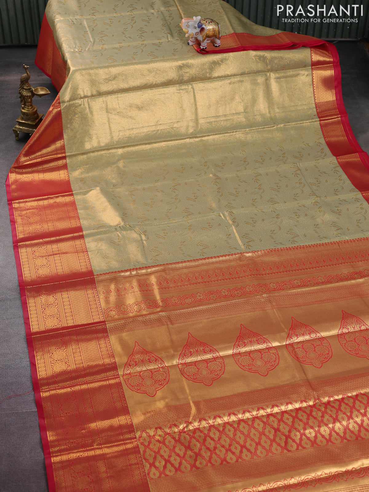 Bangalori tissue silk saree mild pista green and pink with allover zari woven brocade weaves and long zari woven border