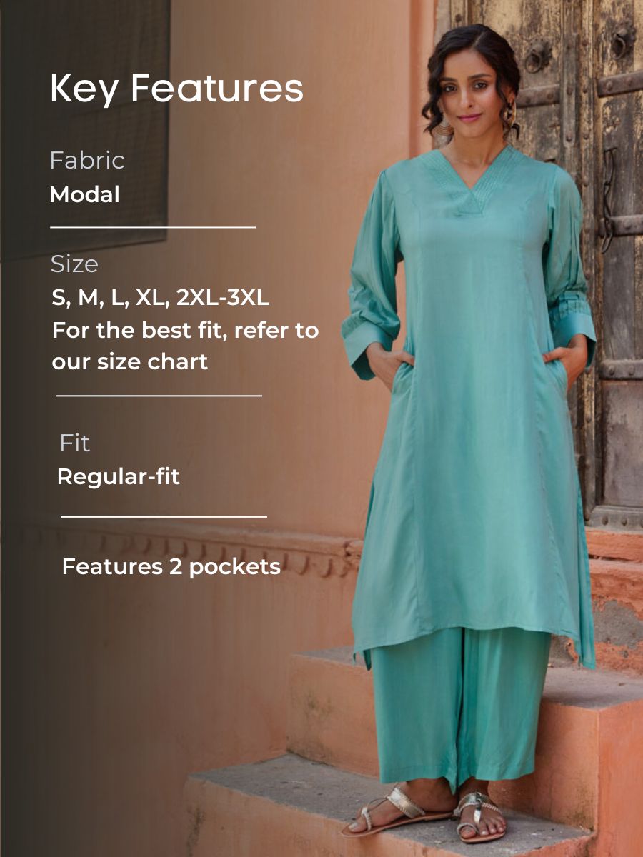 - Features: Panelled kurta with bishop sleeves and v-neckline