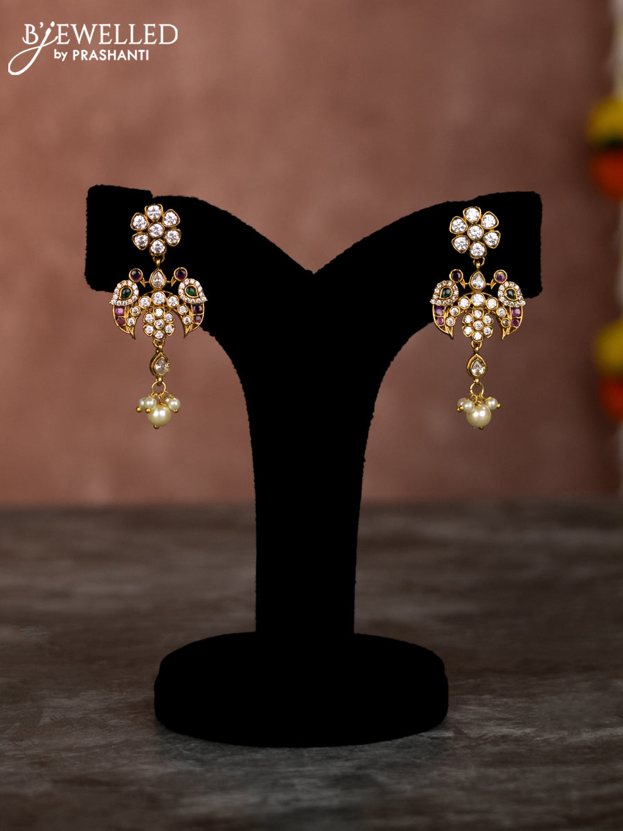 Beaded multilayer green necklace chandbali pendant with kemp & cz stones and pearl hangings in victorian finish