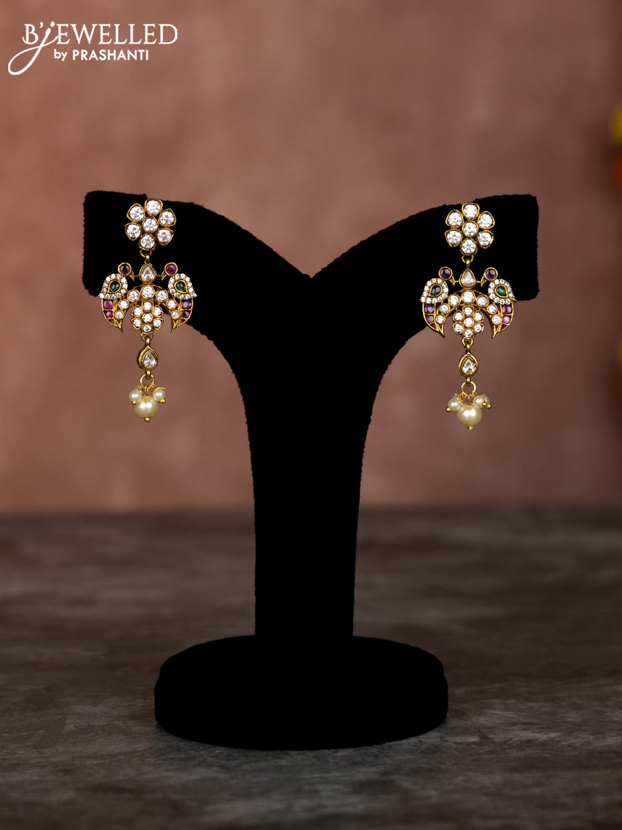 Beaded multilayer mint green necklace chandbali pendant with kemp & cz stones and pearl hangings in victorian finish