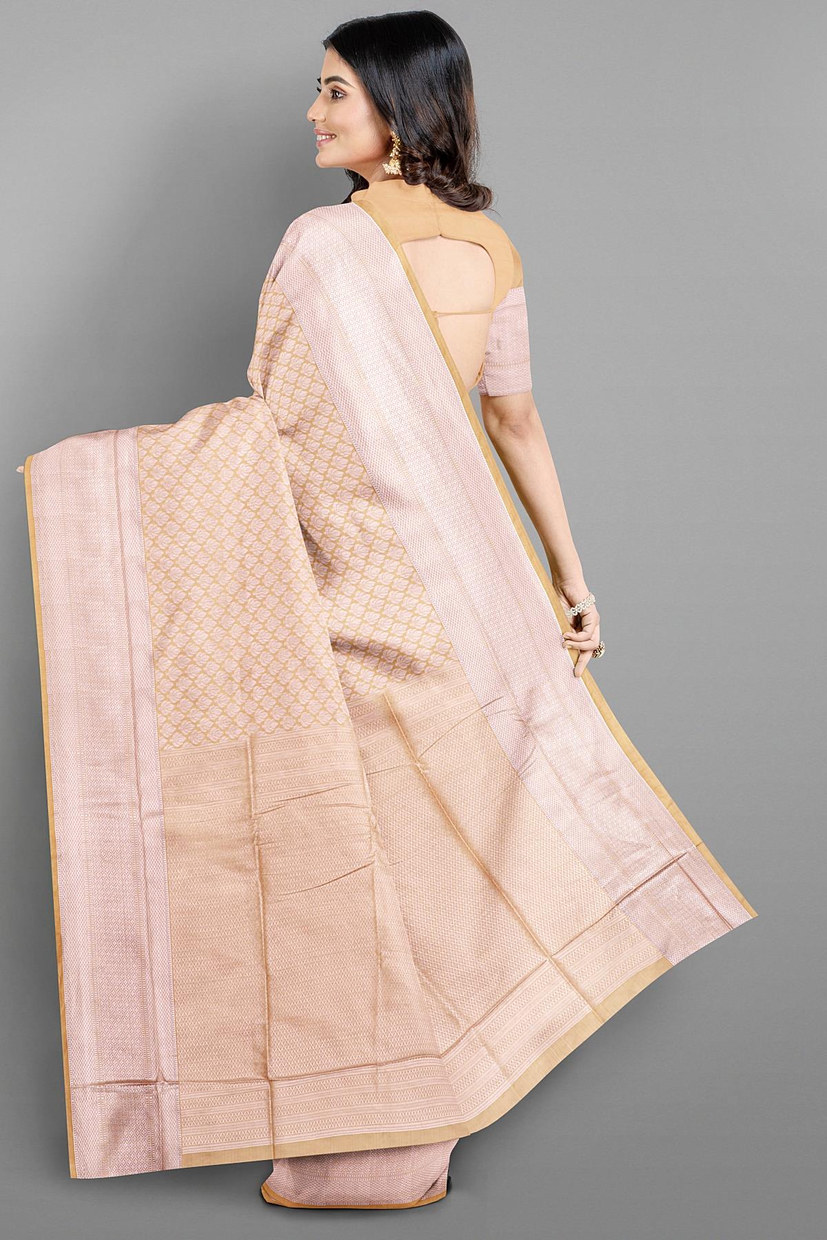 BEIGE and SILVER FLORALS SILK BLEND Saree with SEMI PATTU