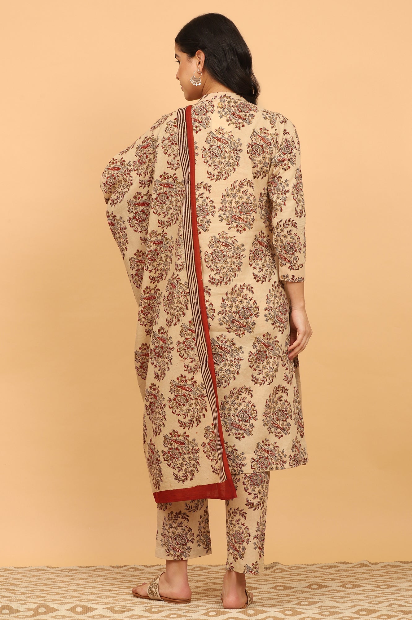 Beige Kalamkari Printed Kurta, Straight Pants and Dupatta Set