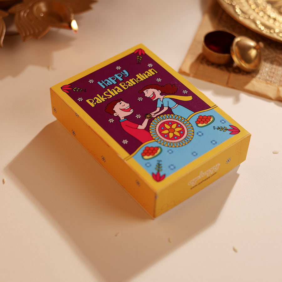 A Rakhi set that’s as adorable as your Bhaiya-Bhabhi!! This Bhaiya-Bhabhi Rakhi box is more than just rakhis. It’s a small bundle of love. It has a special wealth stone rakhi for your brother and a lumba rakhi for your bhabhi that doubles up as an earring. We’ve even added a matching second jhumka to make it a full pair for your Bhabhi. This Rakshabandhan special box is sweet, thoughtful, and makes Rakhi extra special for both of them.