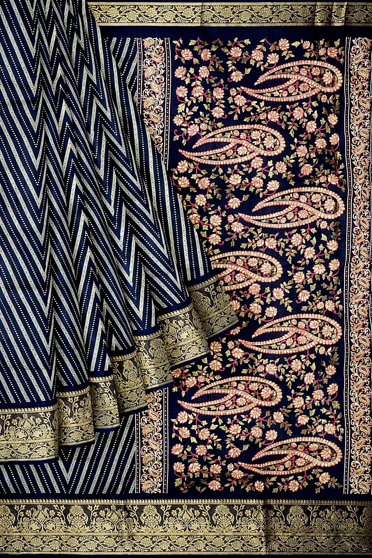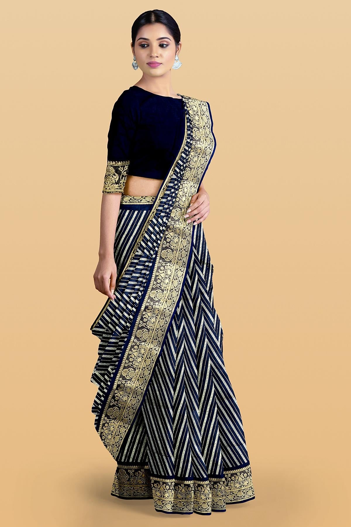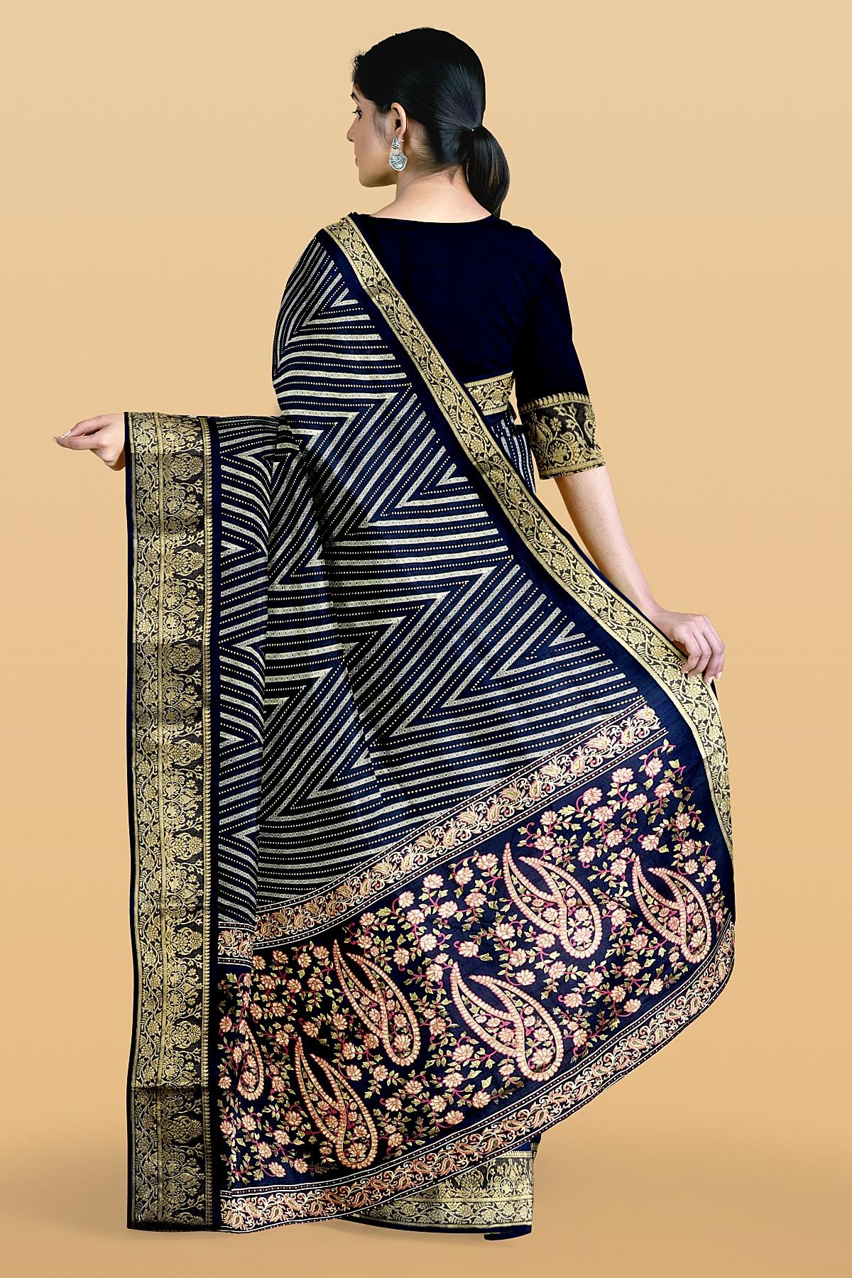 Latest BLACK ZIG ZAG SILK BLEND Saree with ZARI border. This saree comes with PLAIN WITH BORDER SILK BLEND blouse.