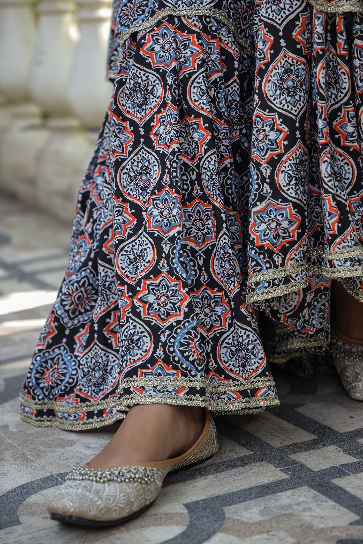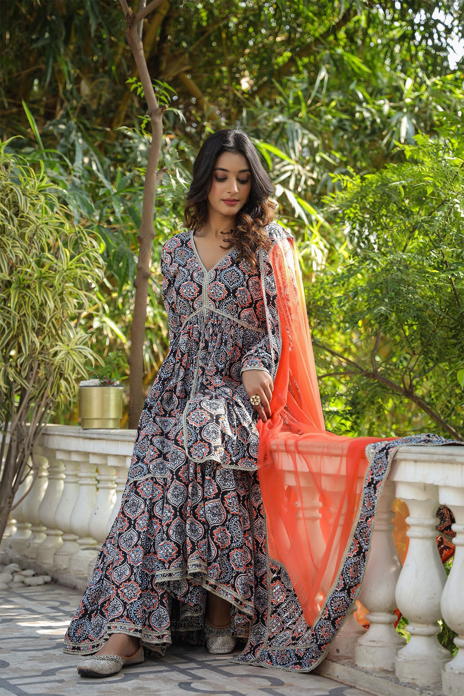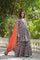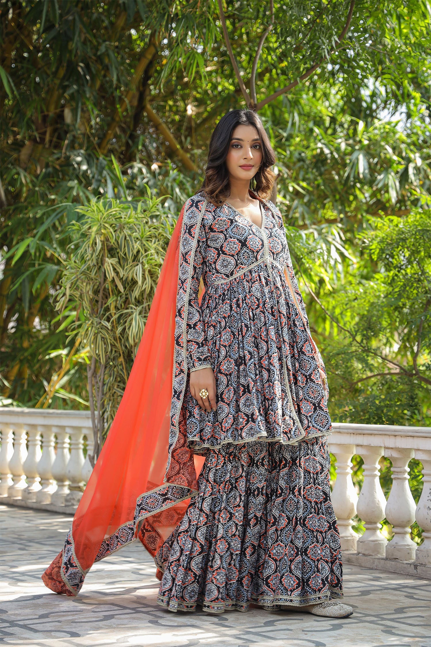 The black cotton floral printed gharara set with netted dupatta for a stylish and charming look.