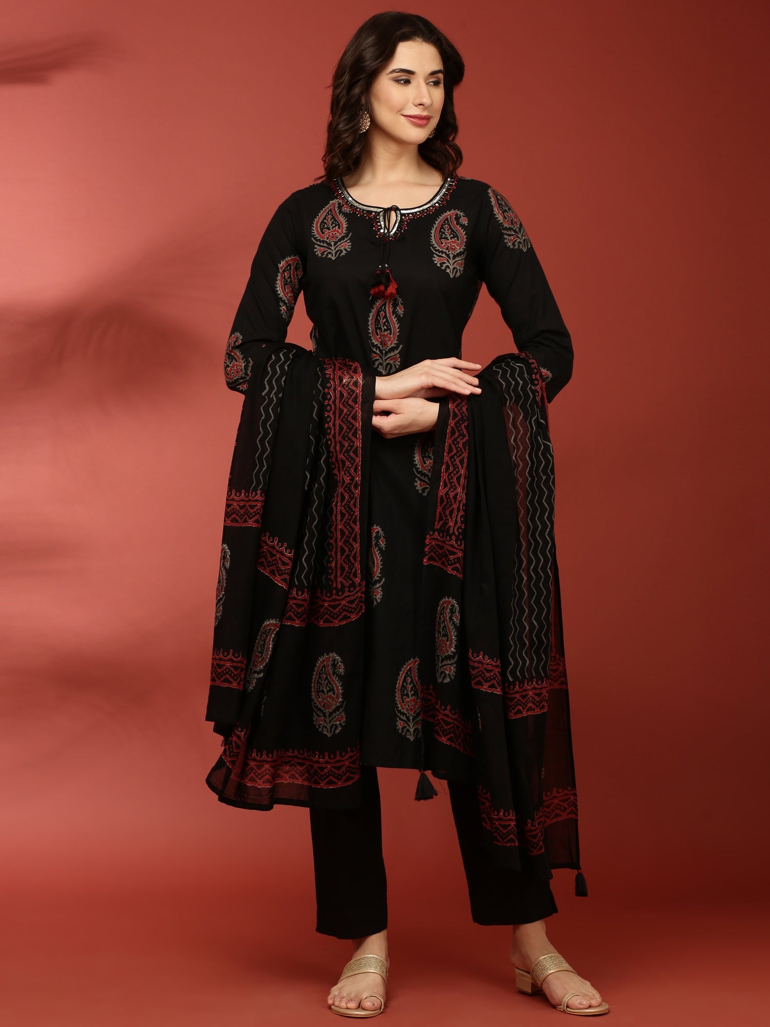 This Black Cotton Printed Three Piece Set combines timeless elegance with comfortable wear. Crafted from soft cotton, it ensures breathability and ease throughout the day. The intricate print adds a refined touch, making it suitable for both casual occasions and stylish gatherings. Designed to provide a cohesive, polished look, this set offers versatility while maintaining a sophisticated appeal.