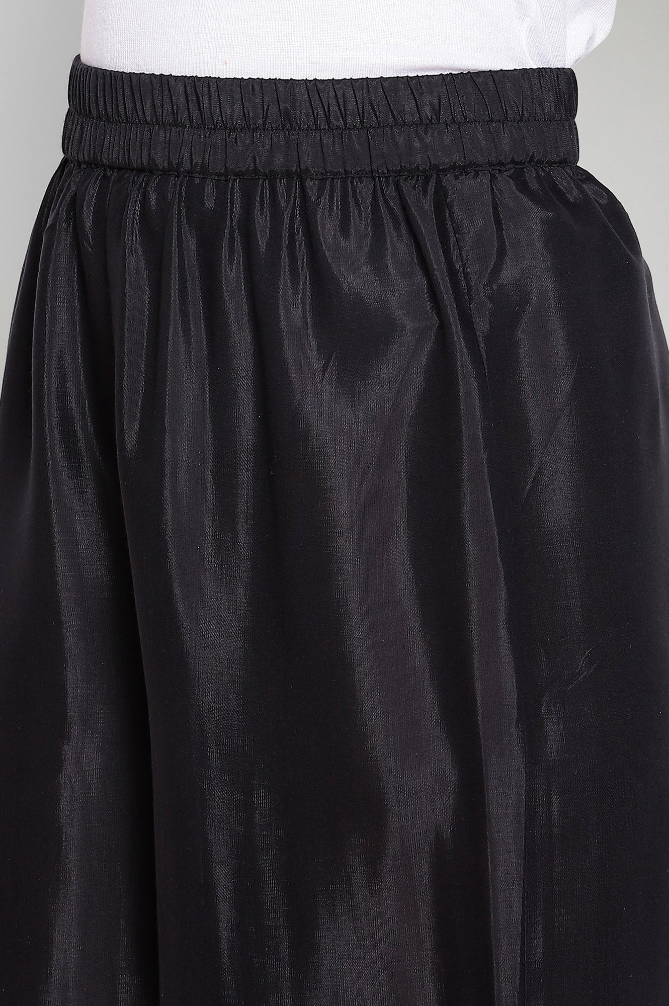 Black coloured round solid straight kurta having zari embroidery, sequin embellishment, round neck and three-quarter sleeves. To complement, the set contains matching palazzos with elasticated waistband and a contrasting golden coloured dupatta.
