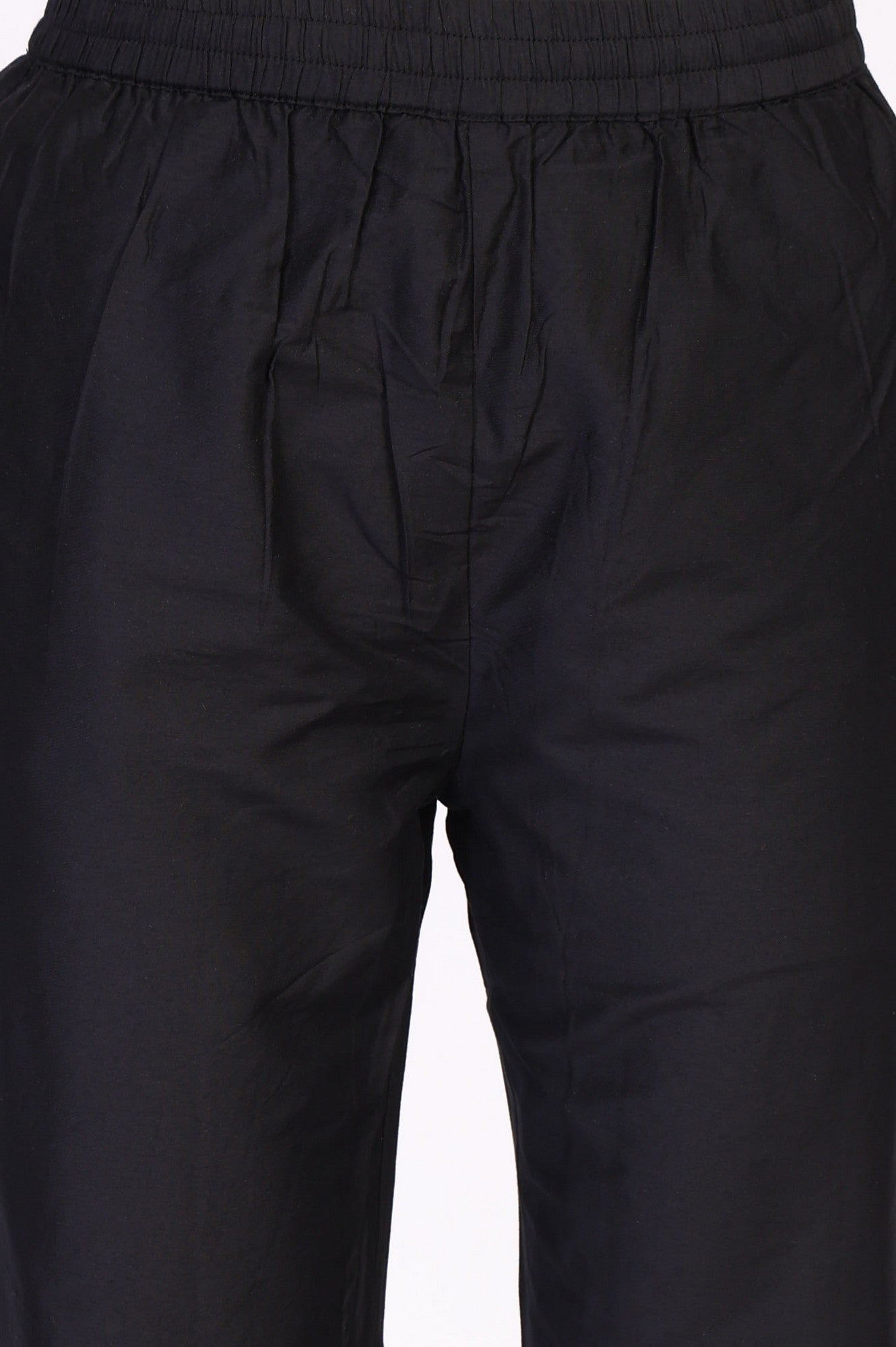 A timeless black kurta set featuring intricate floral thread embroidery on the yoke, paired with solid straight pants and a lightweight organza dupatta. The straight silhouette and breathable woven fabric make it a versatile choice for festive and casual occasions alike.