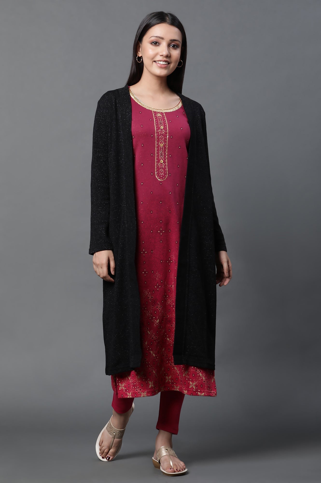 Here is the answer for "what to wear in slight winter breezy weather", A full sleeves gilet with lapel and long length to wear it over any of your kurta or top, which is front open that makes it versatile enough for your winter collection.