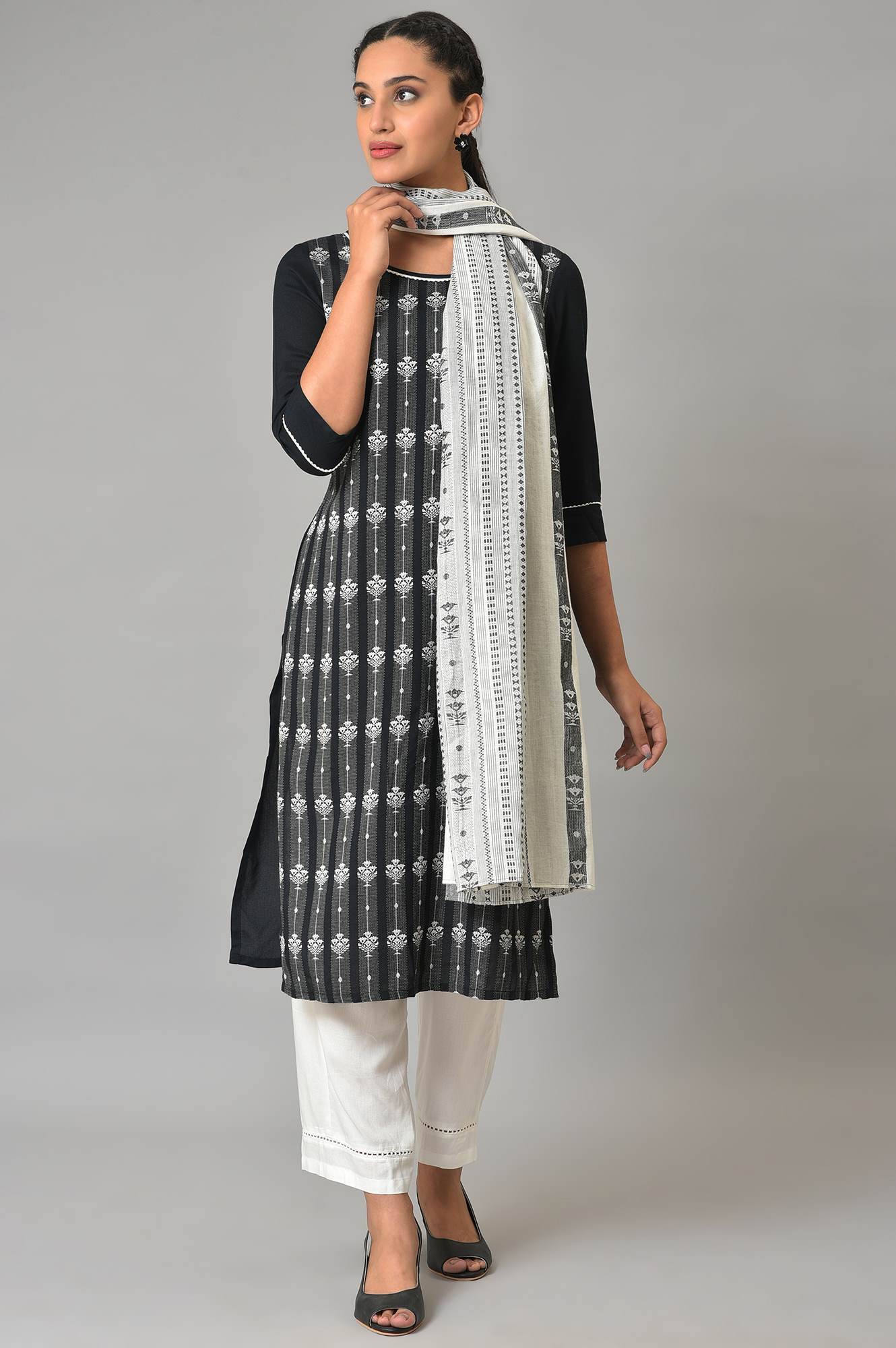 Grace And Luxury Come Together In Our Indigo Three-Piece Set. It Comprises Of A Black Dobby kurta That Features White Floral Motifs, A Straight Palazzo With A Lace Detail And A White Dobby Dupatta. Include This In Your Wardrobe To Have A Perfect Workday.