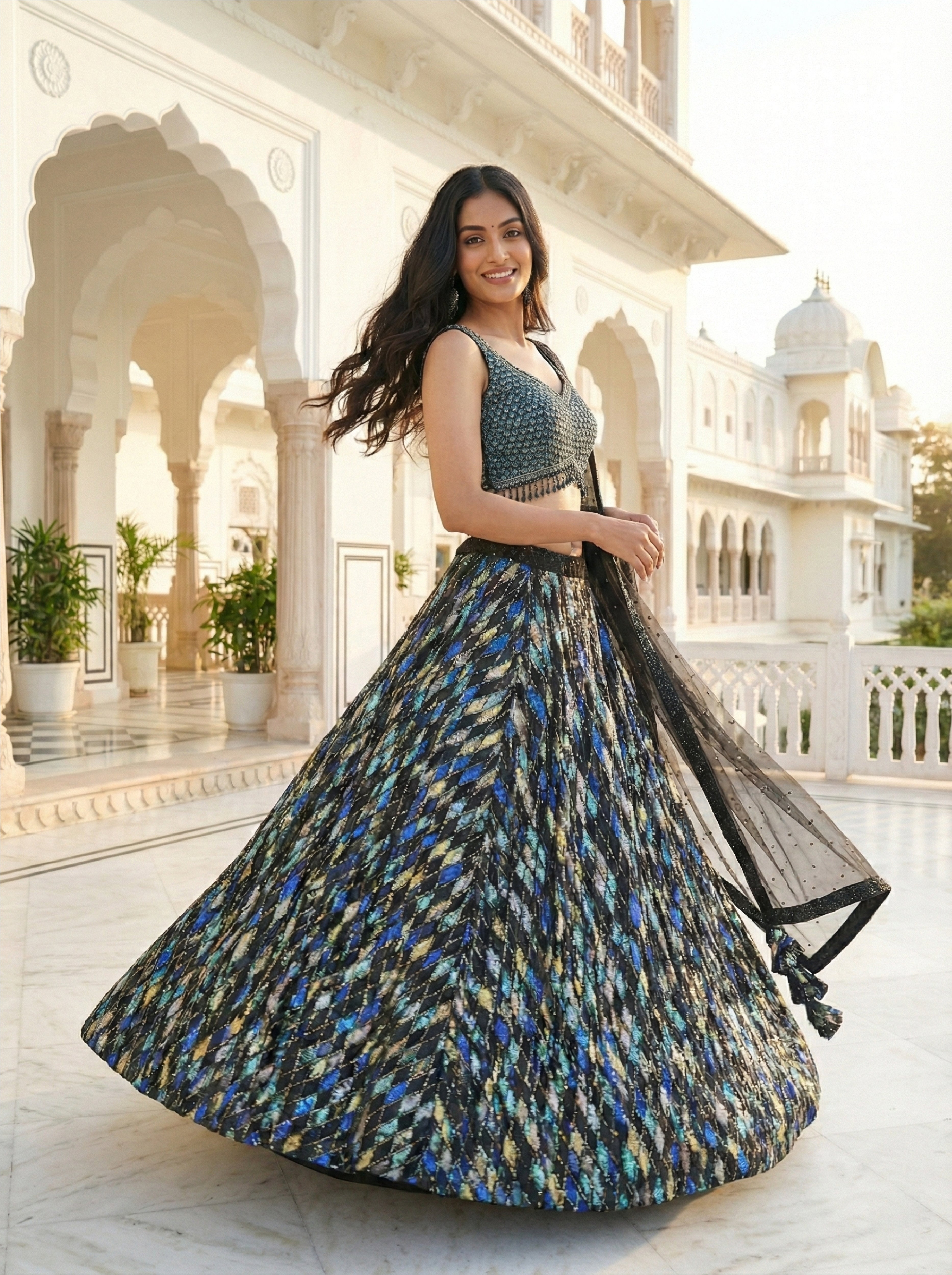Black Net Heavy Sequins And Floral Embroidered Ghagra Set Elevate your festive wardrobe with this exquisite ghagra set, meticulously crafted from premium black net fabric. The ensemble features intricate floral embroidery complemented by lavish sequin work that catches light beautifully, creating a striking visual impact. The voluminous ghagra silhouette offers graceful movement and comfort, while the detailed embellishments showcase traditional craftsmanship. Perfect for weddings, celebrations, and special occasions, this three-piece set combines timeless elegance with contemporary design sensibilities. The luxurious detailing and quality construction ensure you'll make a memorable impression at any event.