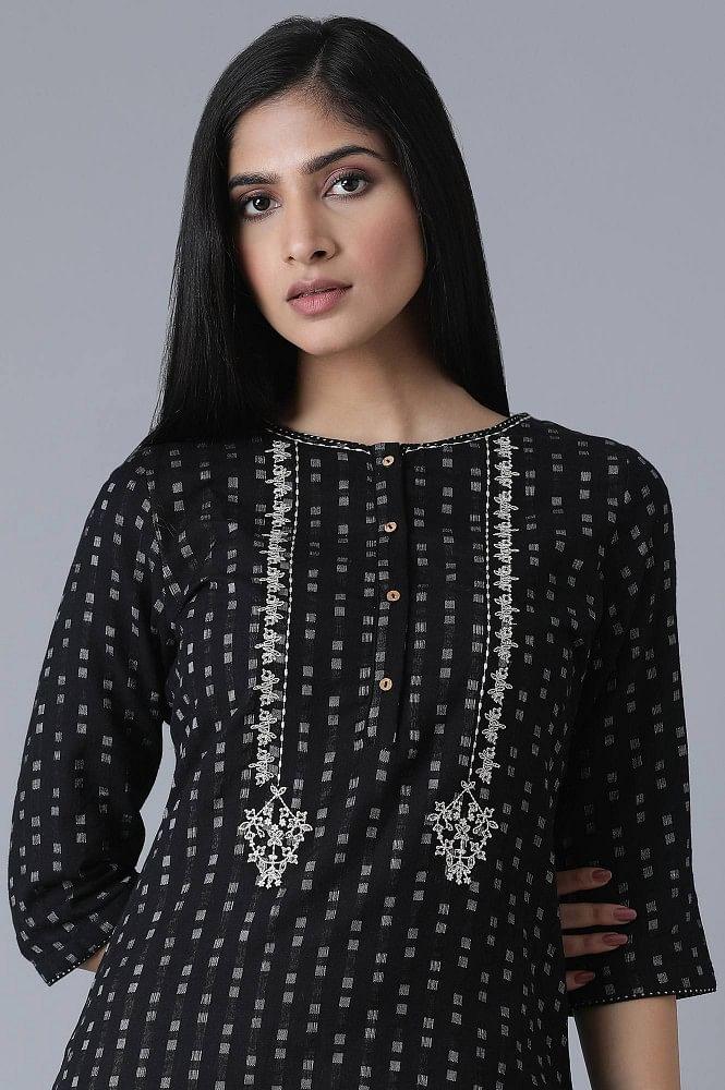Black polka dots yarn dyed embroidered kurta in boat neck and three-quarter sleeves.