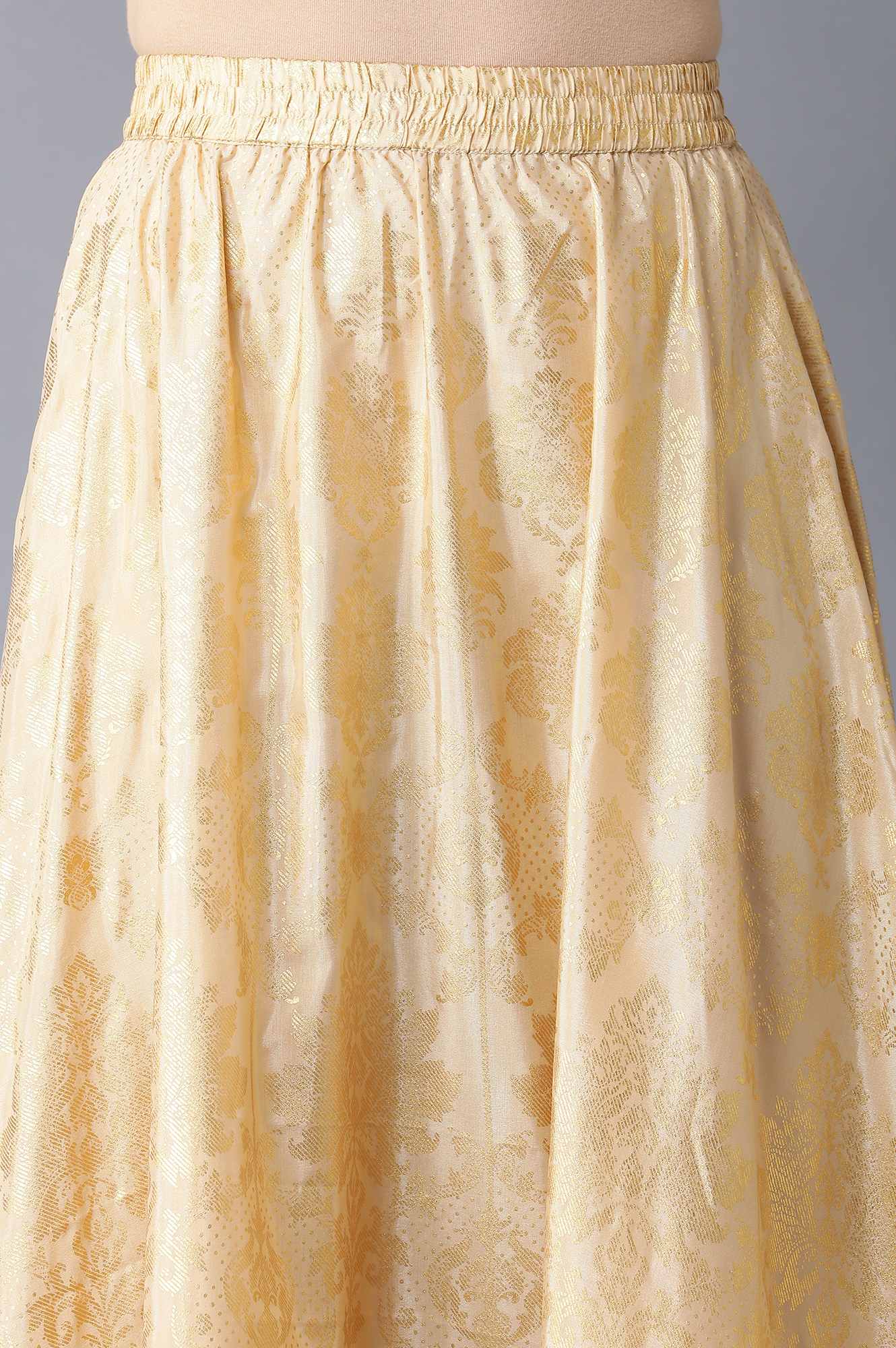Black coloured straight solid kurta featuring zari embroidery, sequin embellishment, mandarin collar with buttoned placket and three-quarter sleeves. To complement, the set contains contrasting beige coloured floral print flared skirt that has an elasticated waistband and chiffon dupatta.