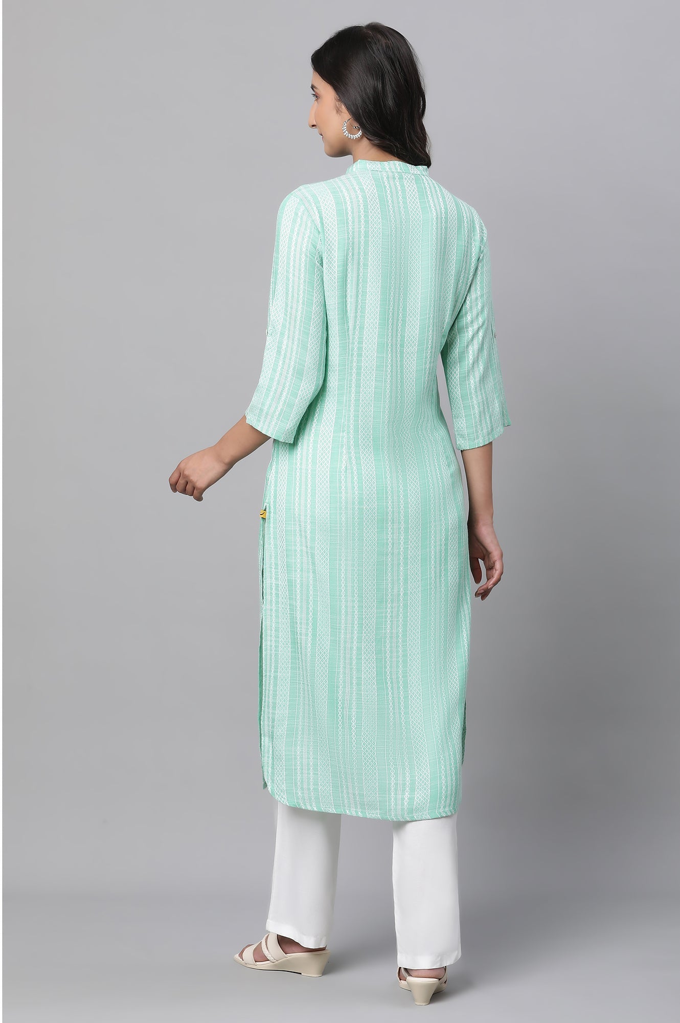 Amp up your casual look by wearing this pretty dark grey printed straight kurta. It has band collar and button placket.