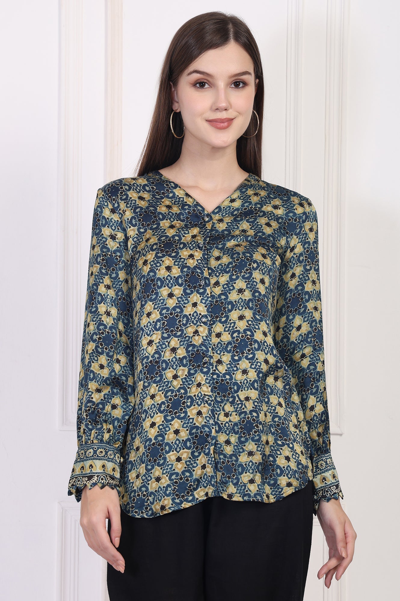 Effortlessly chic! This modal top for women features a captivating abstract print in a rich blue hue, complemented by a mandarin collar and long sleeves. The button-down design adds a touch of sophistication, while the straight silhouette ensures comfort and versatility. Perfect for casual outings or office wear, this breathable modal top is a must-have for your wardrobe. Pair it with tailored trousers or jeans for a polished look that transitions seamlessly from day to night.