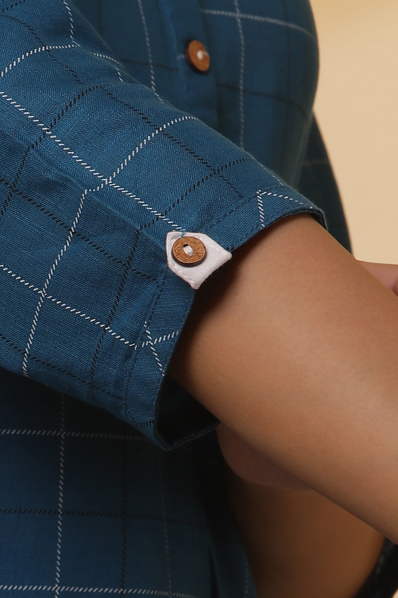 Simple and timeless, this printed blue check kurta is a wardrobe staple. It comes with a neat and crisp shirt collar, wooden buttons on the placket, an inverted box pleat at the front and a white coloured tab on the sleeves to add a pop of contrast. The kurta is paired with matching culottes.