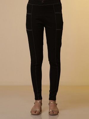 Our rayon crepe lurex striped kurta is a stunning addition to your wardrobe. This splendid piece features A-line silhouette with V neckline. The chunky embroidery detail on the neck and sleeves add an extra touch of boldness and sophistication while the lurex adds a subtle sparkle that will distinguish you from the crowd. This asymmetrical kurta is apired with our blue denim lycra jeggings.
