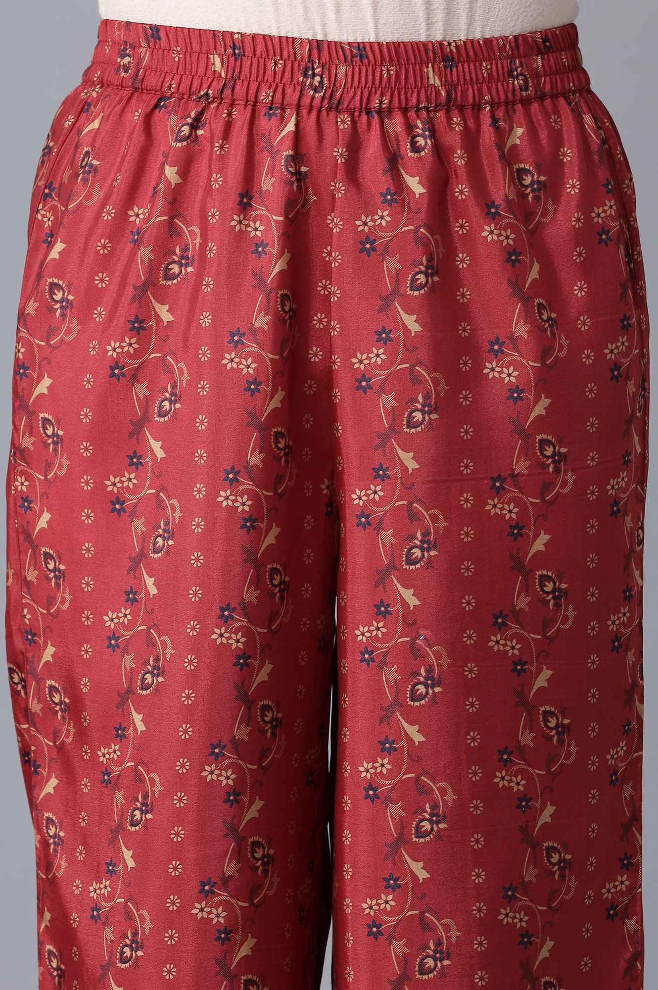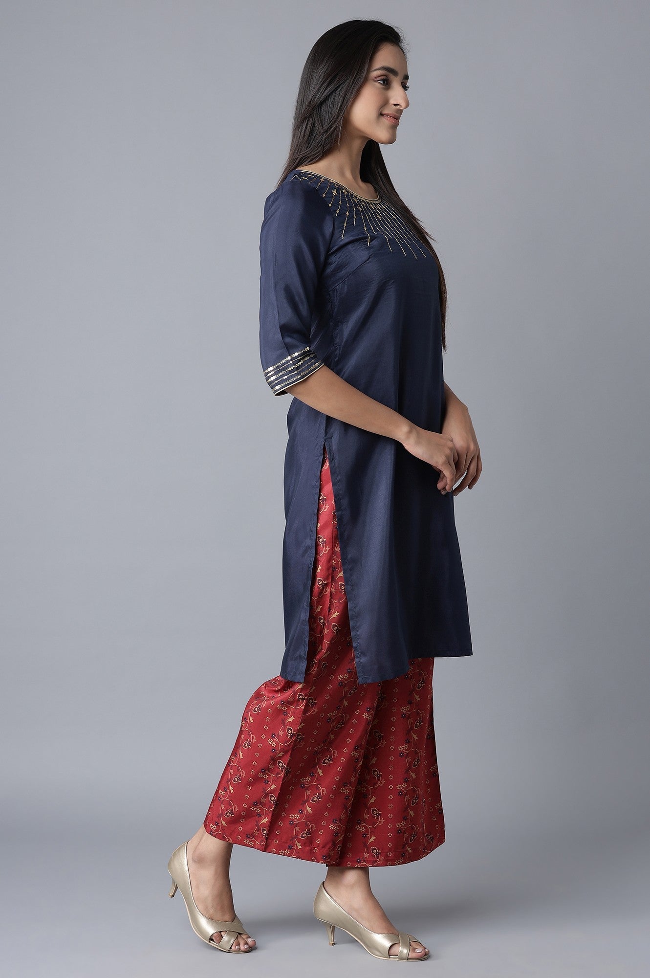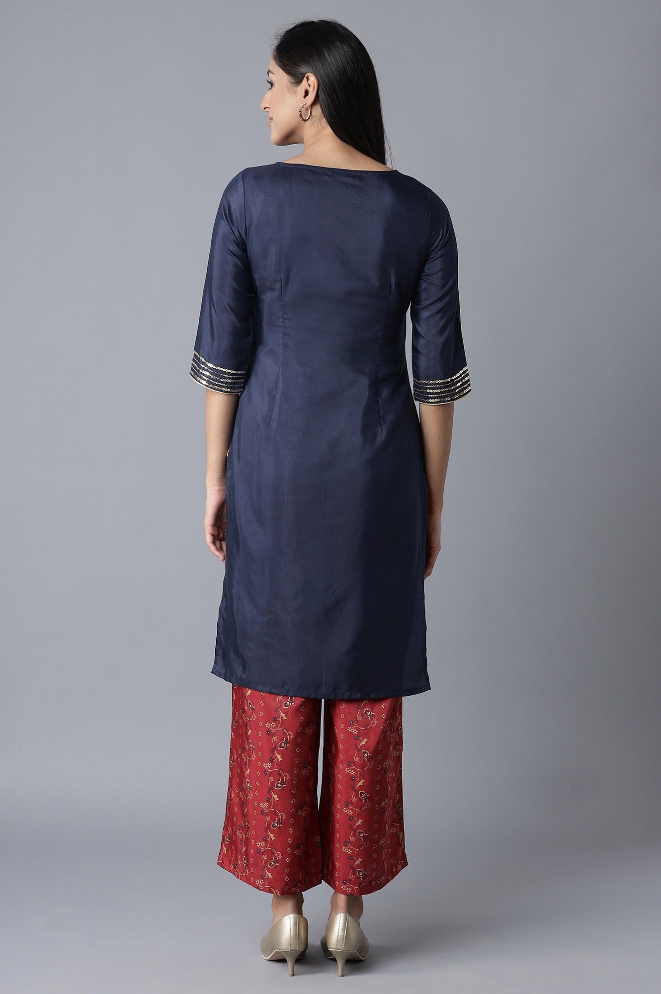 This Light Festive kurta Set Will Make A Gorgeous Addition To Your Ethnic Wear Wardrobe. Crafted In Premium Poly Shantung Fabric, This Zari Embroidered, Indigo kurta With Sequin Detailing Is Surely A Limelight Stealing Deal. It Comes With Ankle Length Palazzos Having Floral Print And Mid-Rise With Elasticated Waistband.
