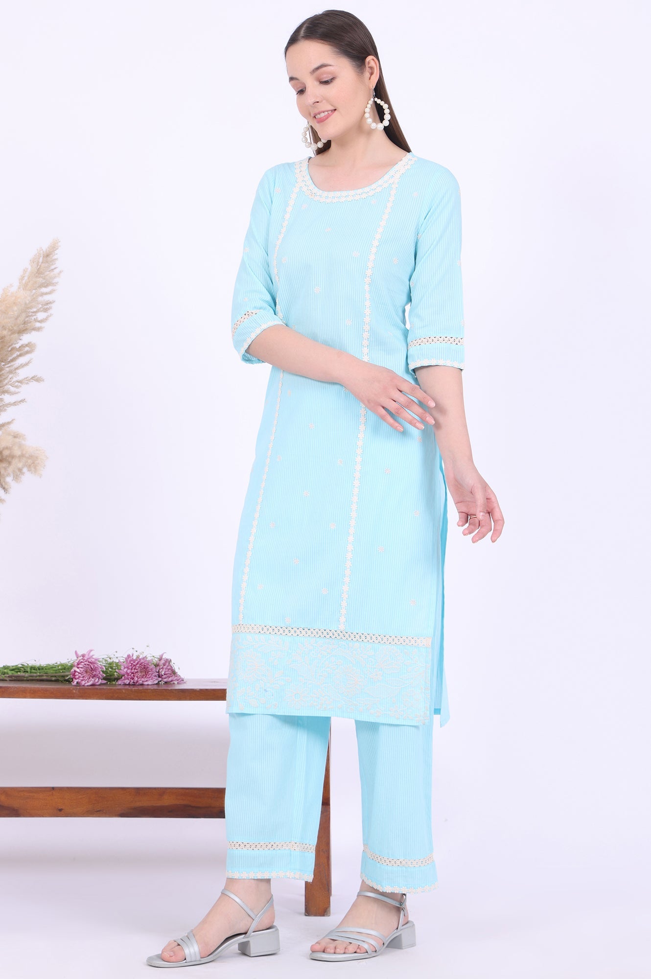 Elevate your ethnic wear collection with this exquisite Aurelia ensemble for women. This set features a straight kurta, palazzos, and a dupatta in a beautiful sky blue hue, perfect for special occasions. Crafted from 100% pure cotton, it ensures maximum comfort and breathability. The kurta boasts a round neckline, three-quarter sleeves, and elegant lace detailing, while the straight-cut design offers a sleek silhouette. The fusion ethnicity adds a modern touch to this traditional outfit. With a convenient hand-wash care instruction, maintaining the set's pristine condition is effortless. Make a statement at your next event with this stunning Aurelia ethnic set that combines style, comfort, and versatility.