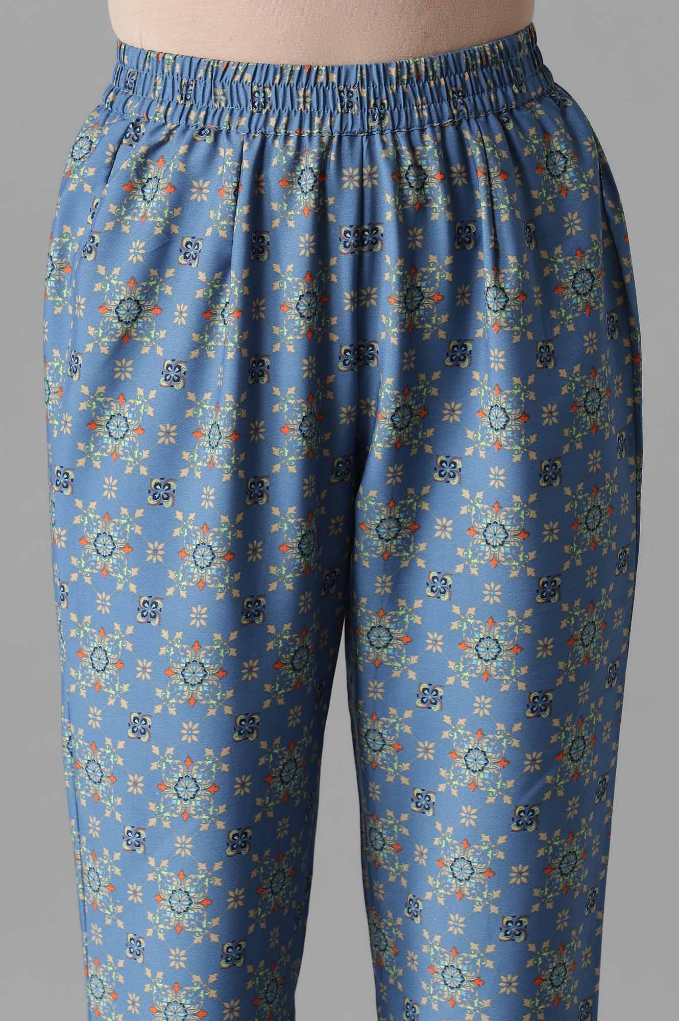 Be dressed la mode this festive season. Perfect for all occasions, this kurta set contains a blue solid panelled kurta having zari embroidered yoke with sequin embellished round neckline and three-quarter sleeves. Well-matched with stellar blue ankle length printed trousers.