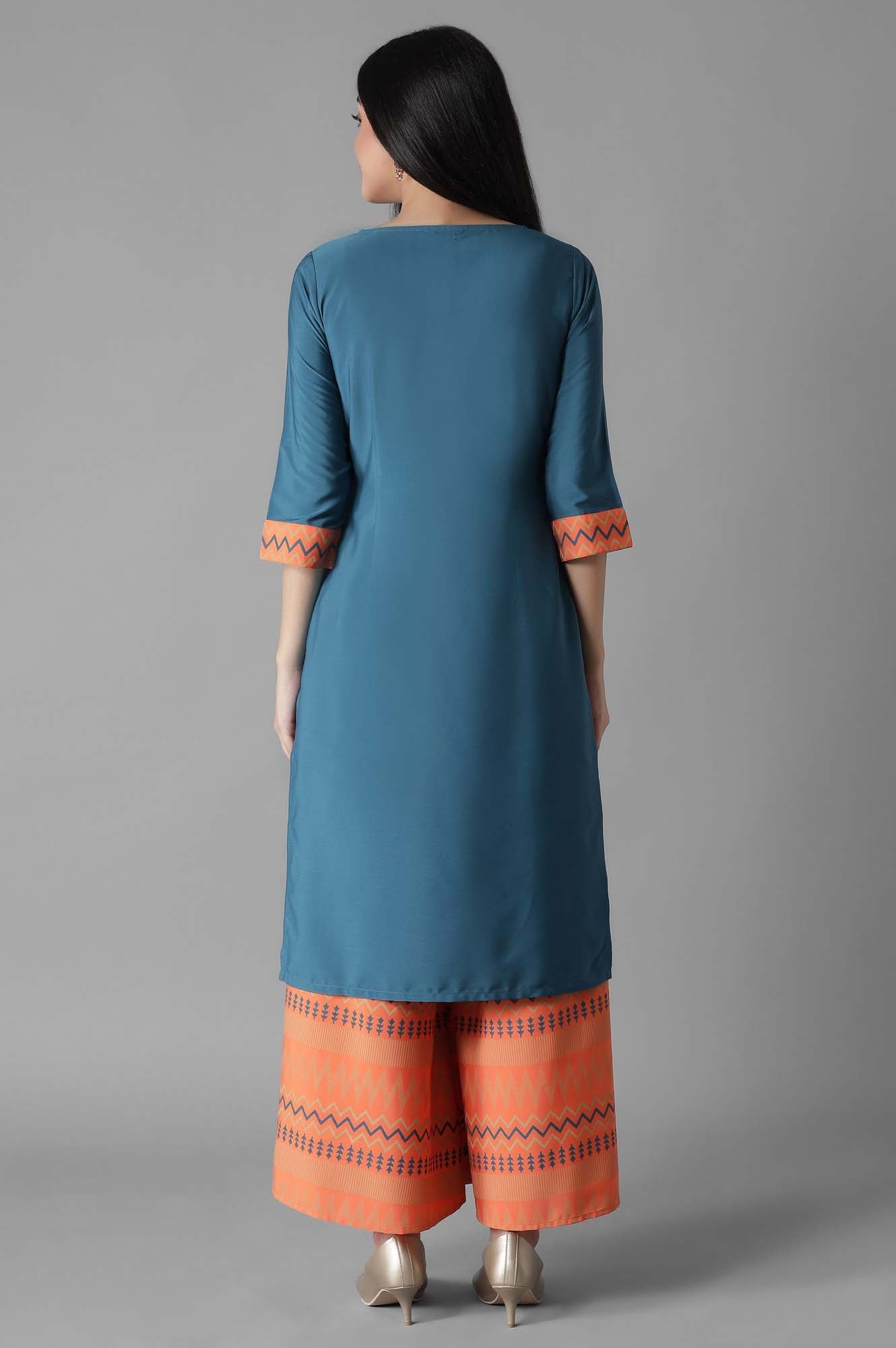 A kurta set laced with elegance to make you look graceful on all occasions. It features a blue solid straight kurta having zari embroidered yoke with sequin embellished round neckline and three-quarter sleeves. Perfectly paired with contrasting orange ankle length printed culottes.
