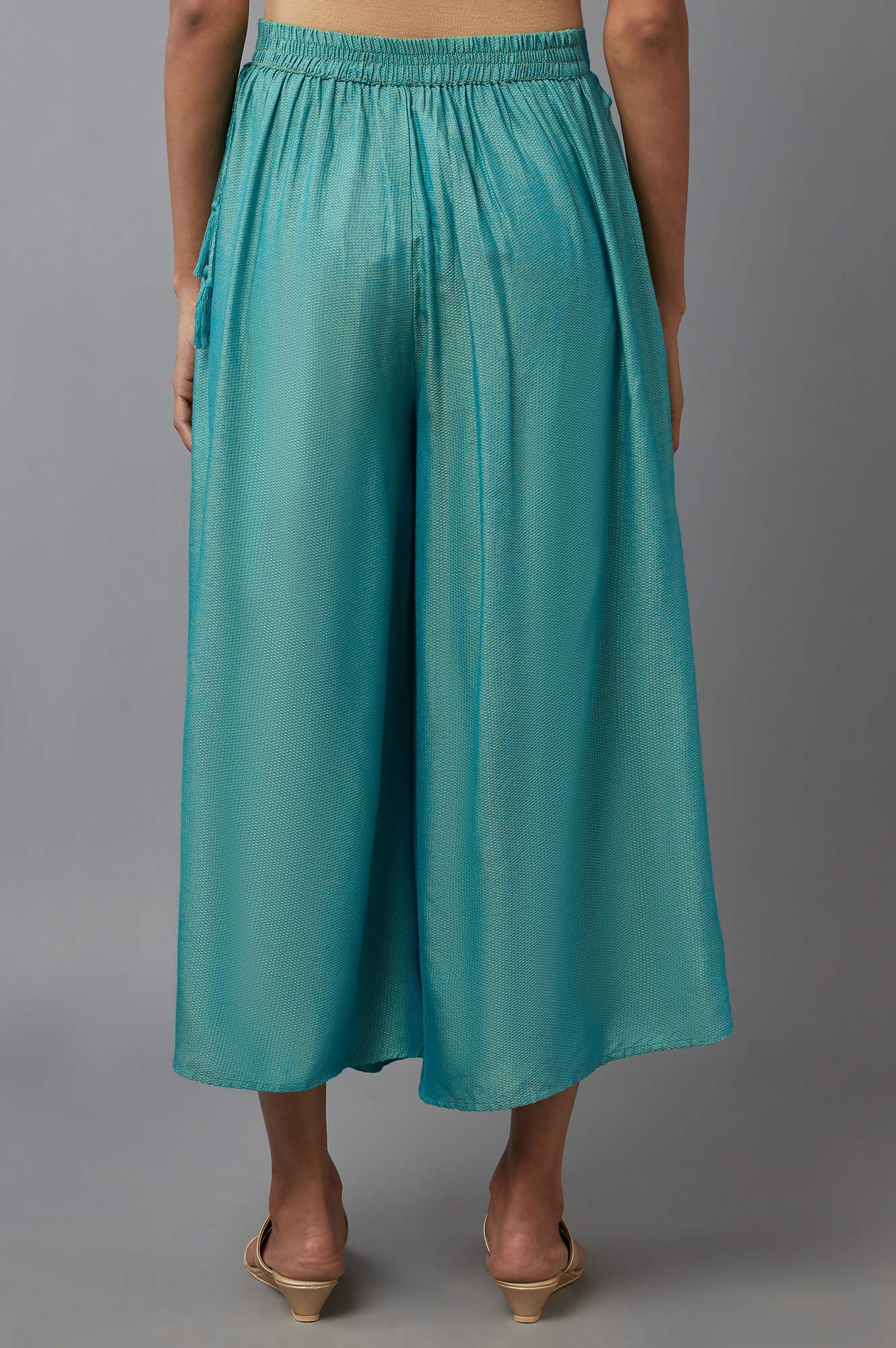 Blue solid straight fit palazzos with elasticated back and tie-up detail.