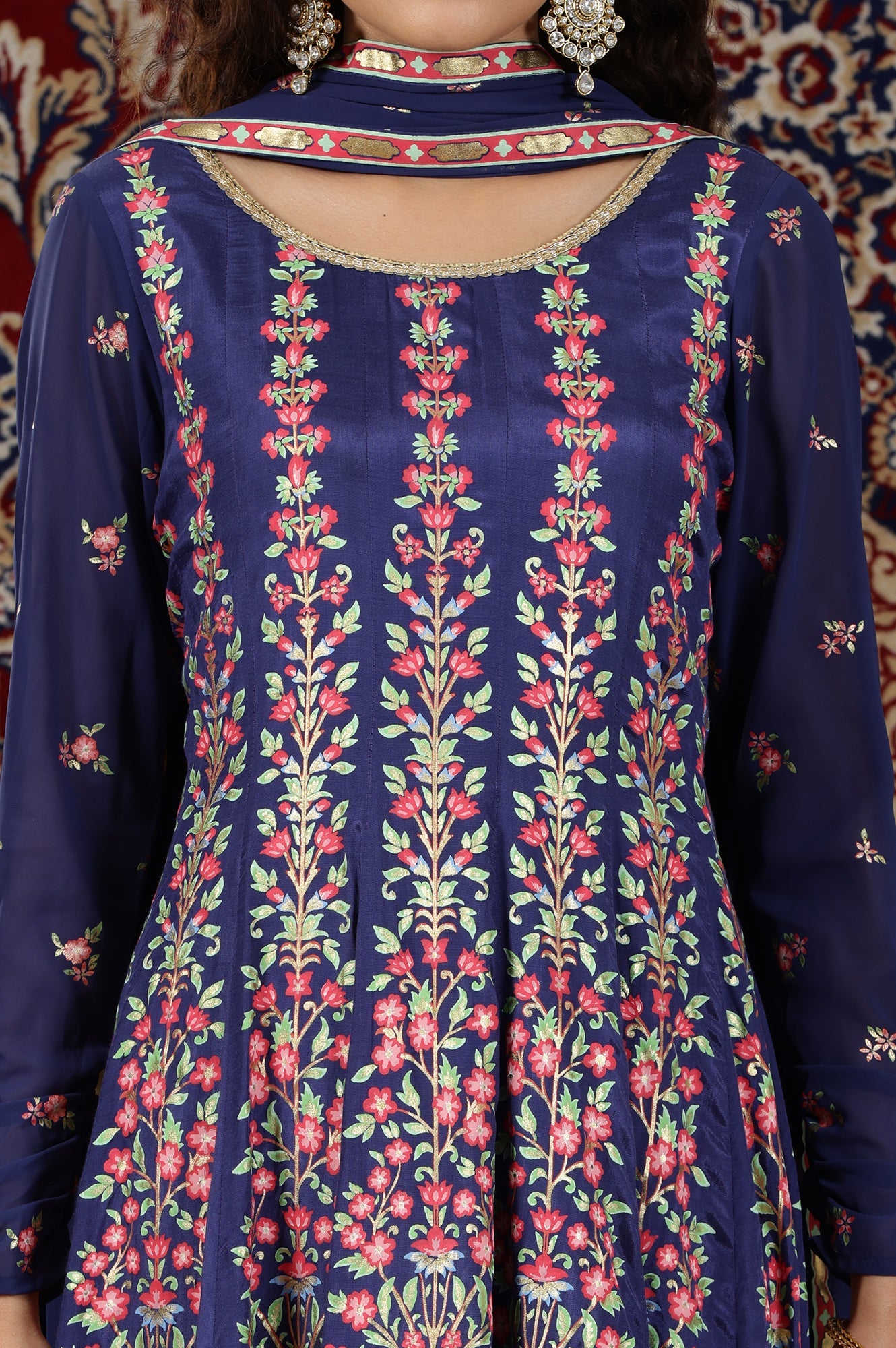 Blue Floral Printed Flared Kalidar Dress and Dupatta Set