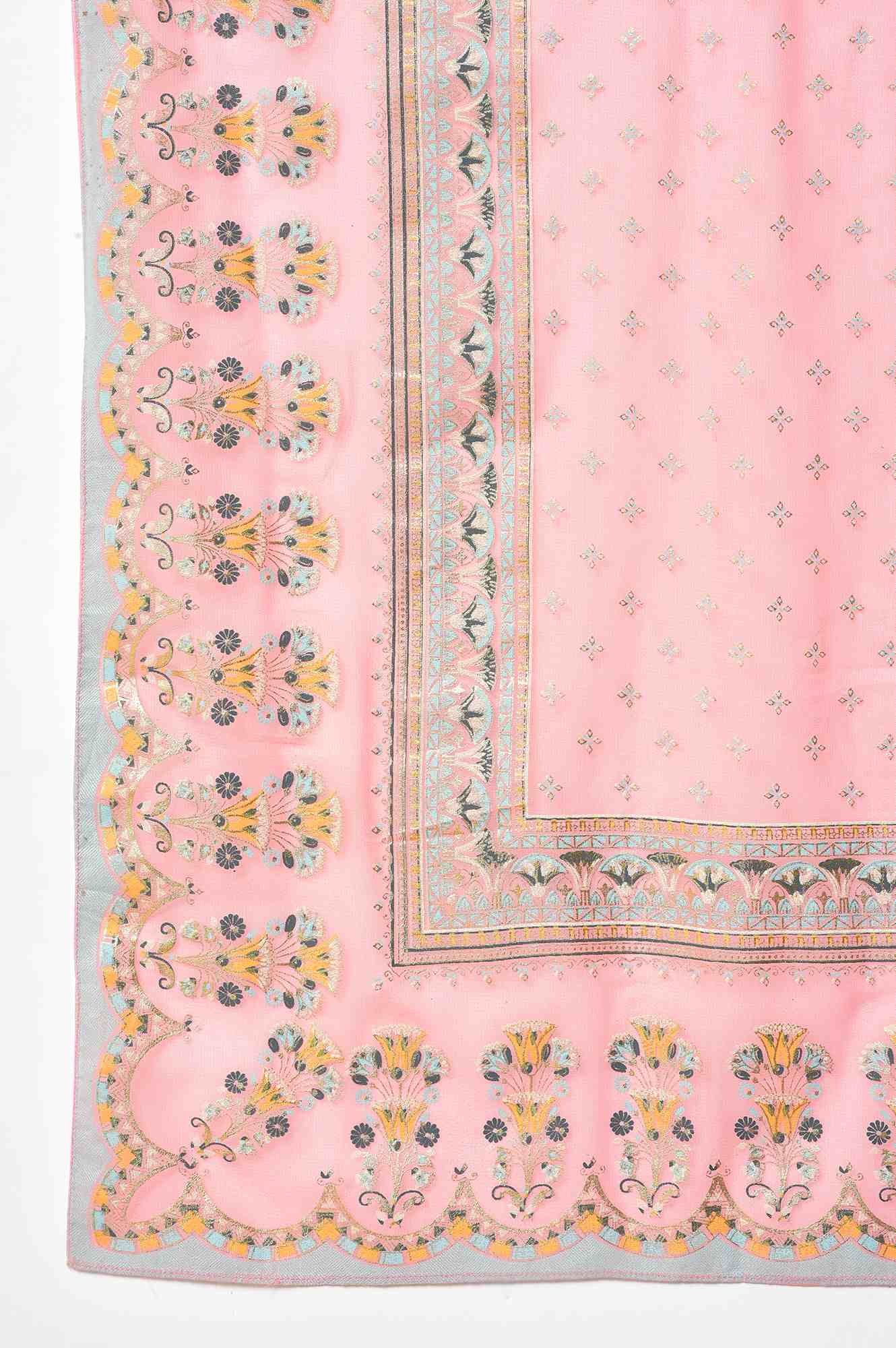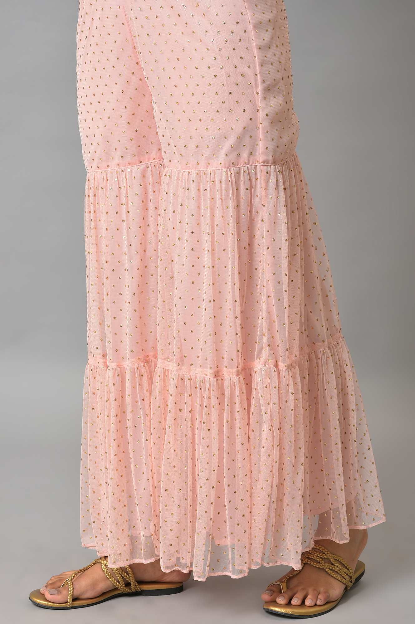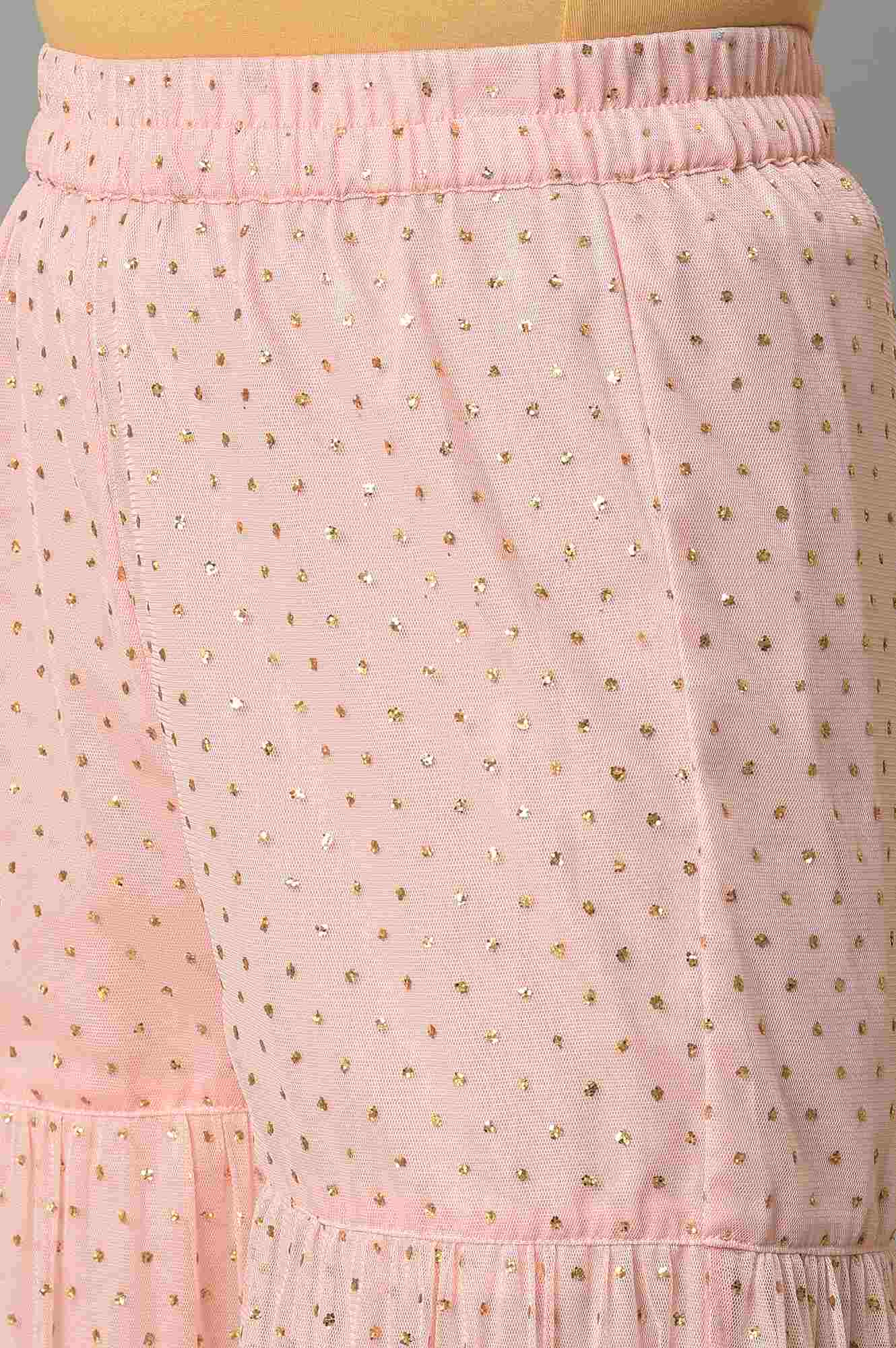 Our Ice Blue Kurta Features An Artistic Print Accentuated With Gold Foil On A Rich Viscose Fabric To Give You A Perfect Festive Look For Any Festivities. This Style Is Coordinated With Pink Glitter Net Sharara Having Attached Lining And A Matching Printed Chiffon Dupatta.
