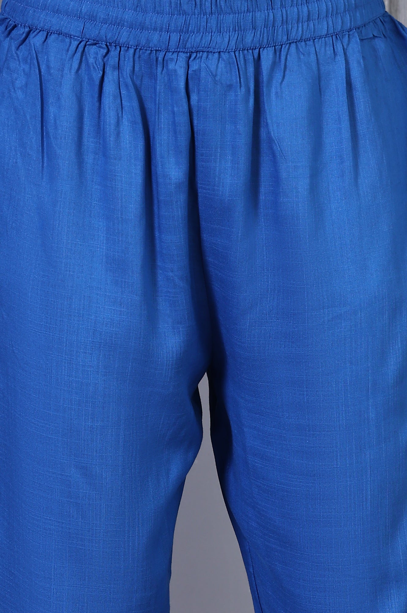Blue Floral Printed Lace Rayon Flared Kurta, Pants and Dupatta Set