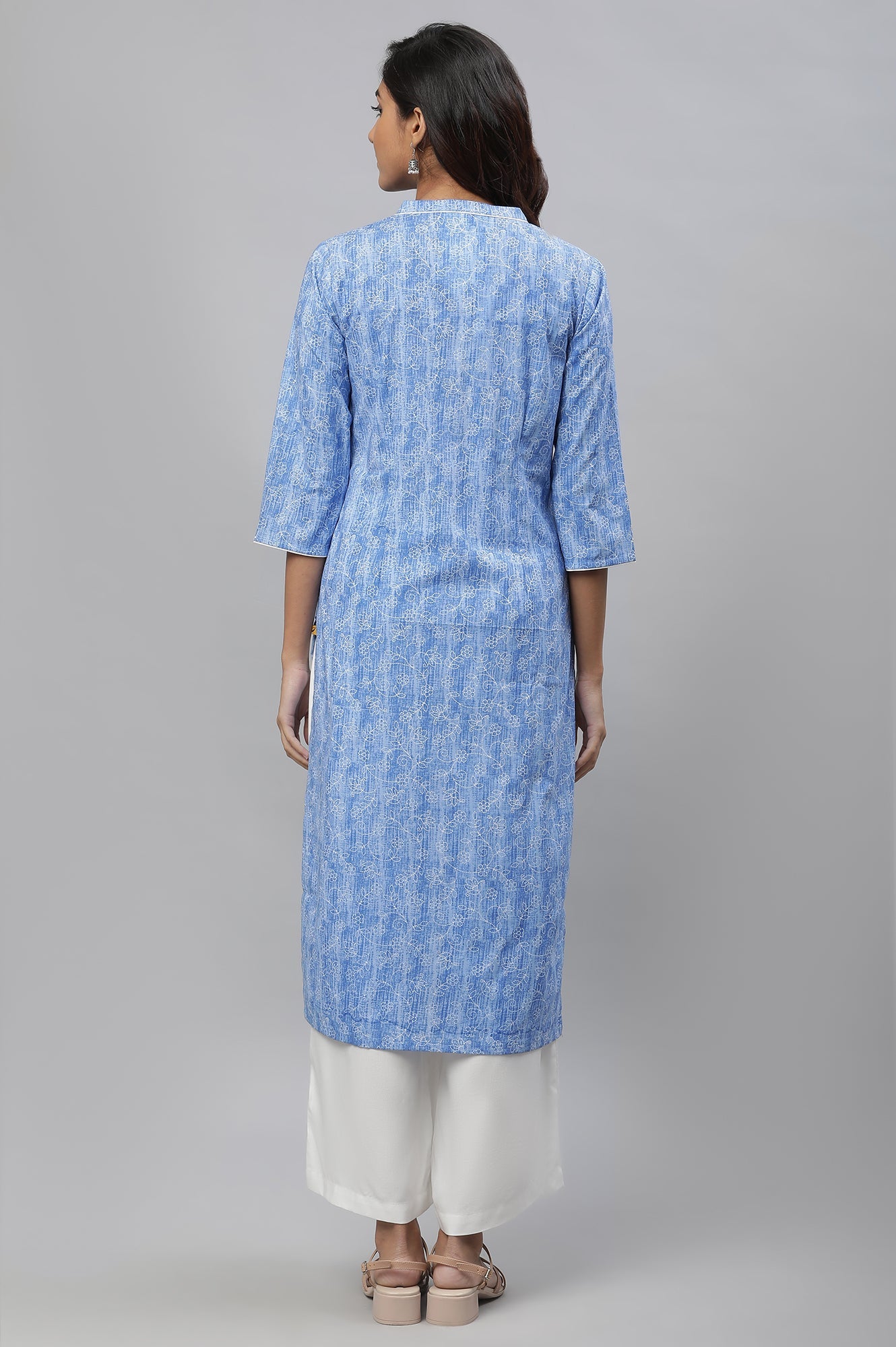 A fresh, monochromatic floral kantha printed straight kurta with smart mandrin neckline detail with placket highlighted contrast piping. This gives you a space to choose from variety of bottoms in contrast.