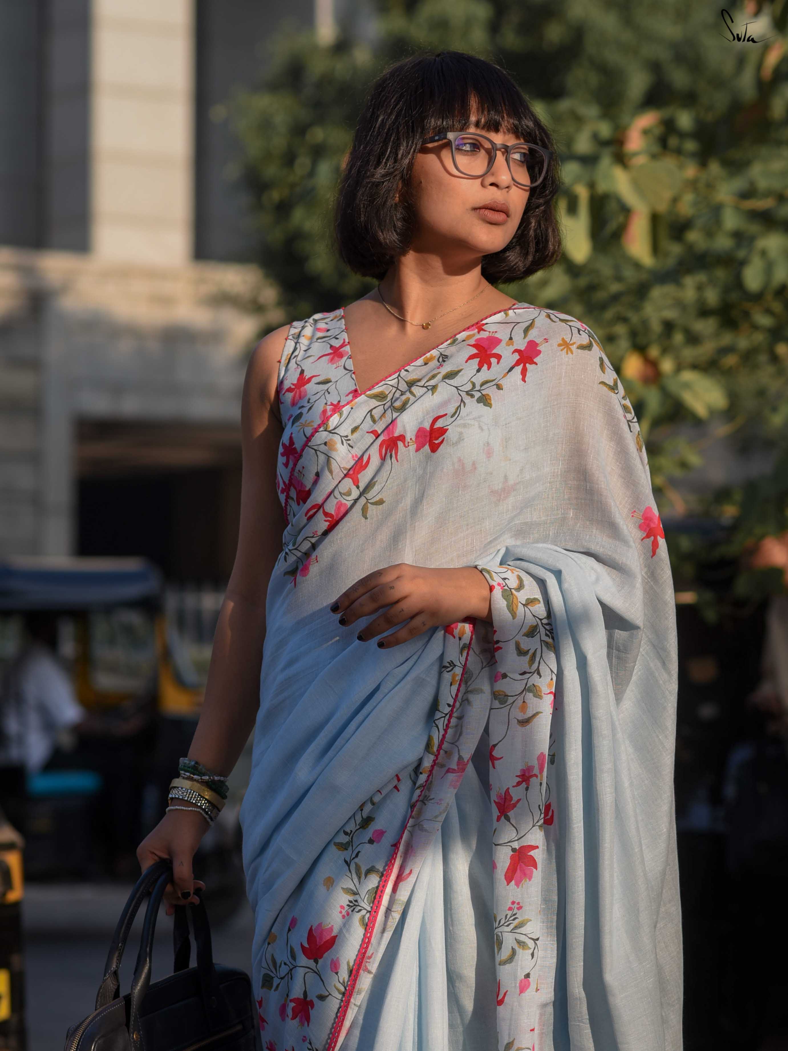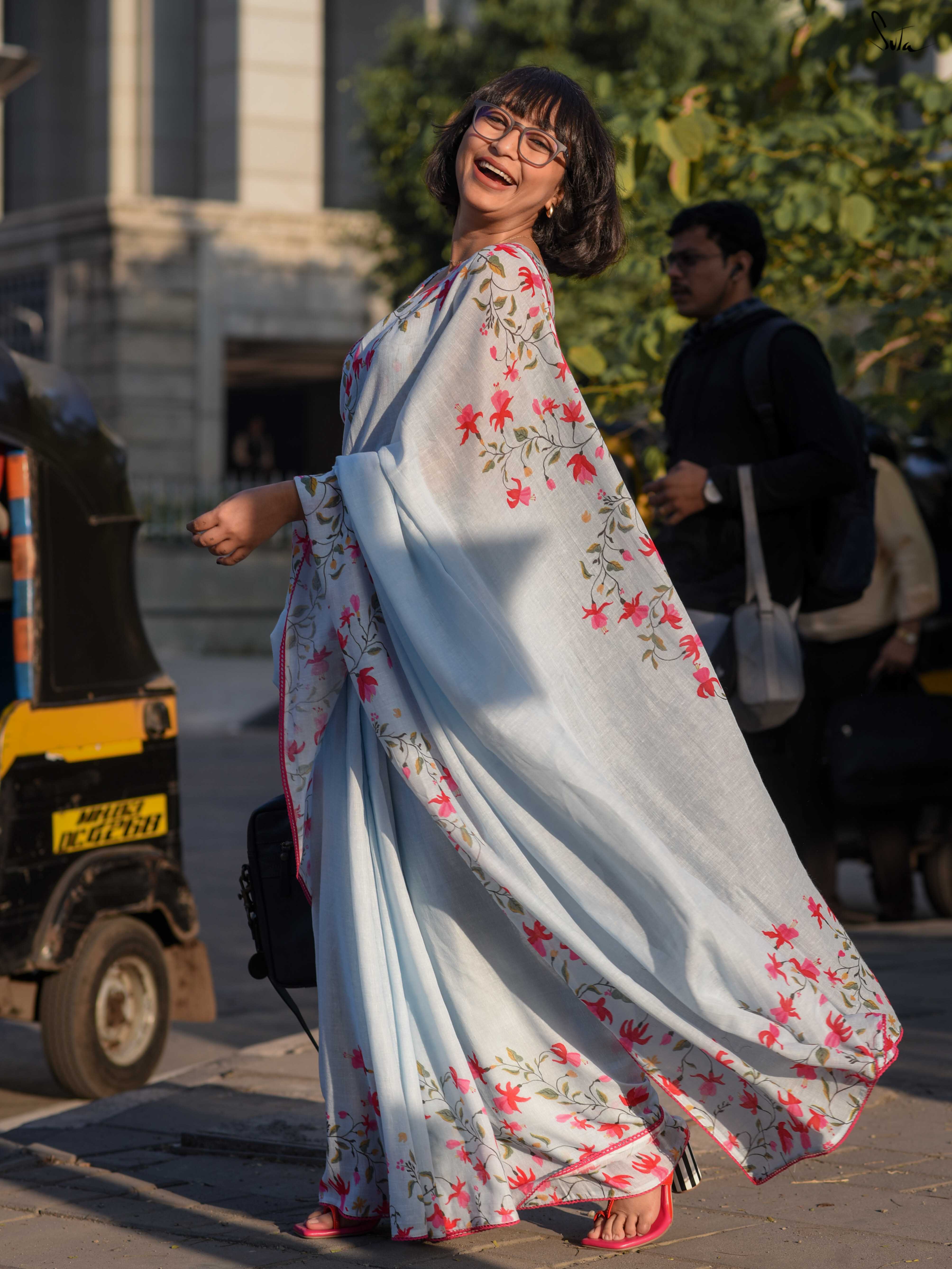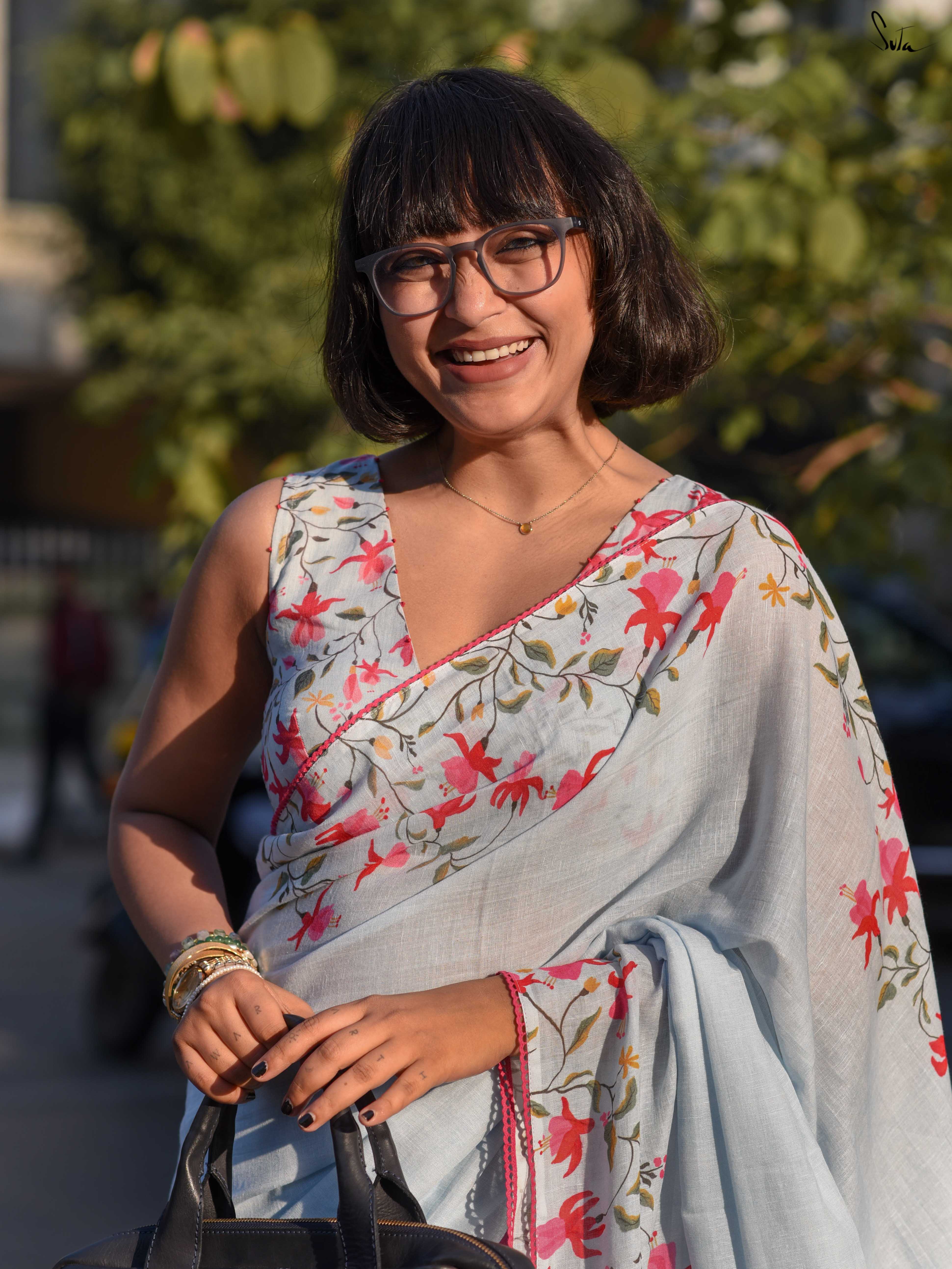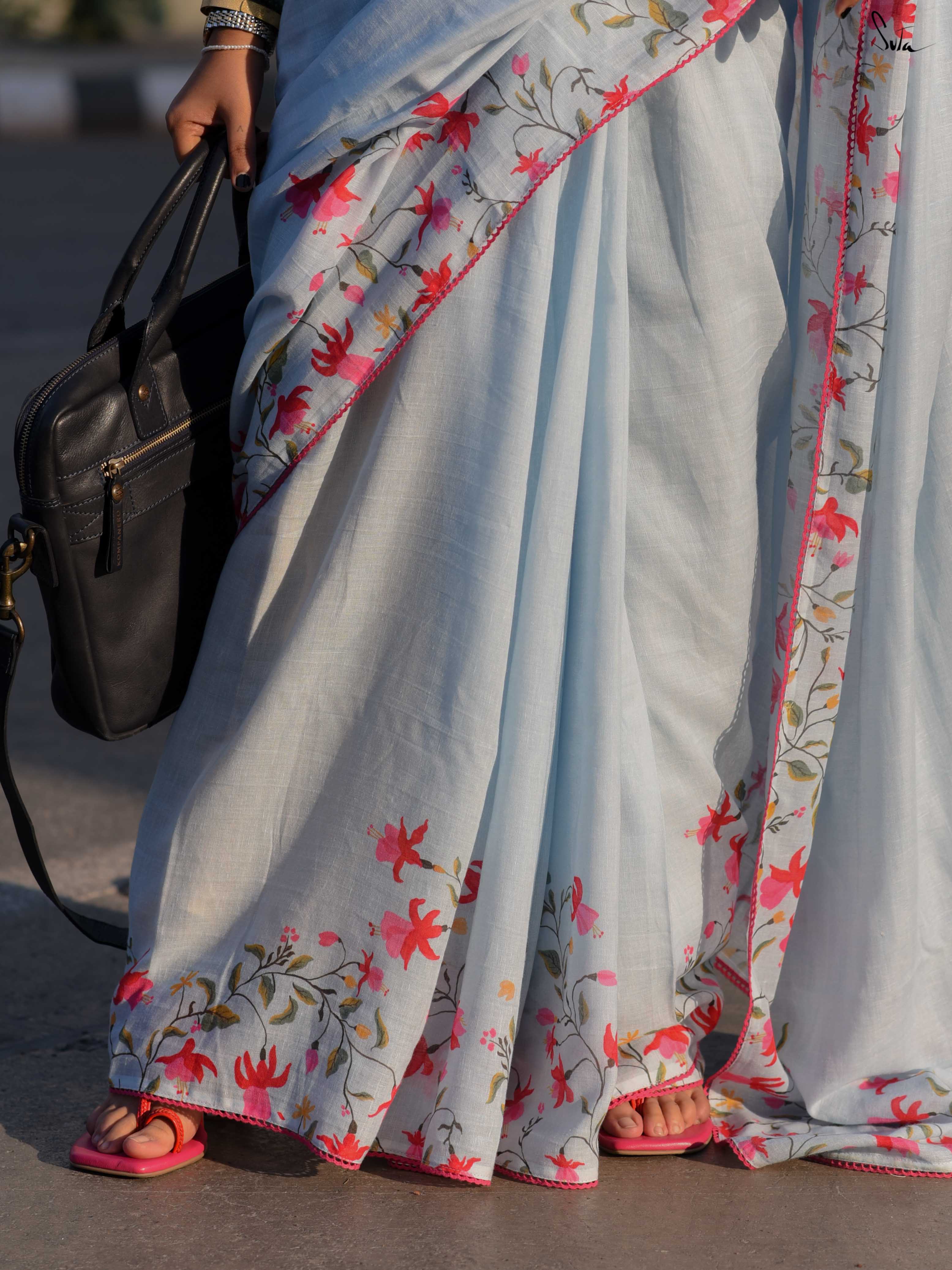 She drapes the saree absentmindedly, the cotton-linen light against her skin. Fuchsia florals appear gently, never interrupting the calm, just adding colour where it’s needed. Pink lace follows the edge like a quiet reassurance.