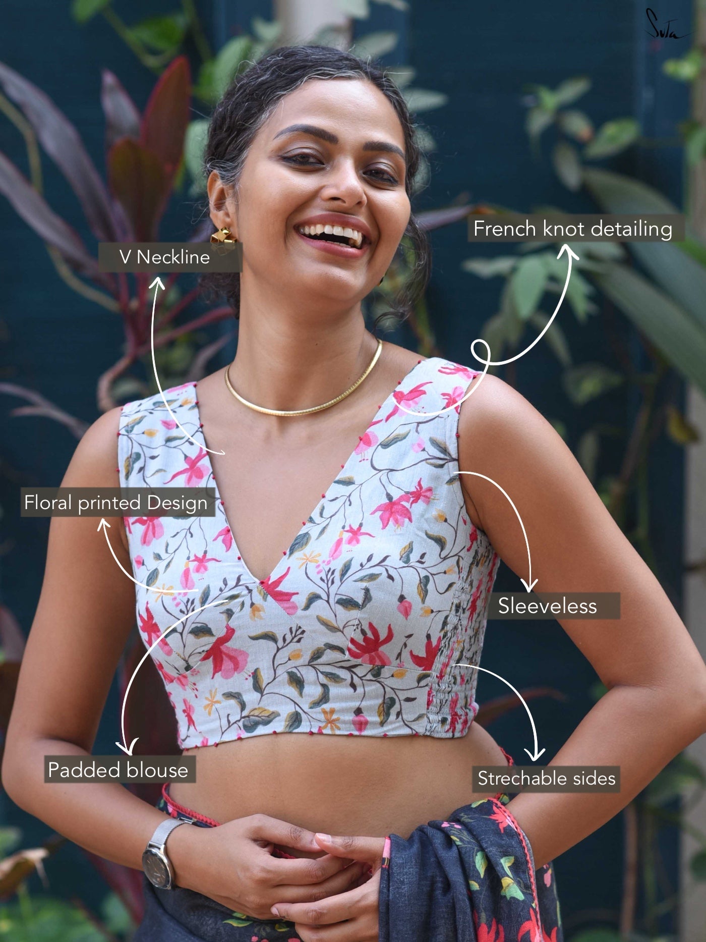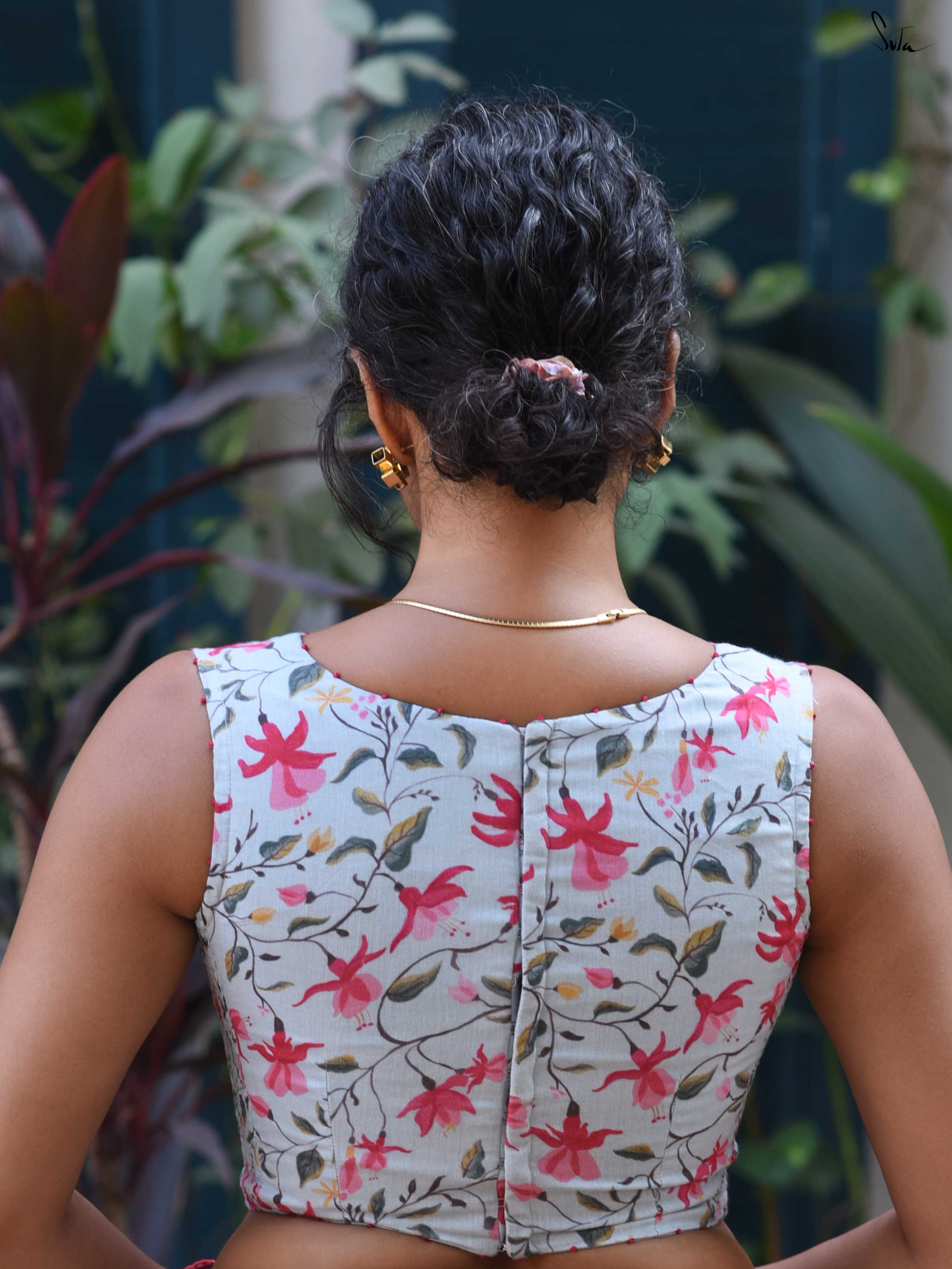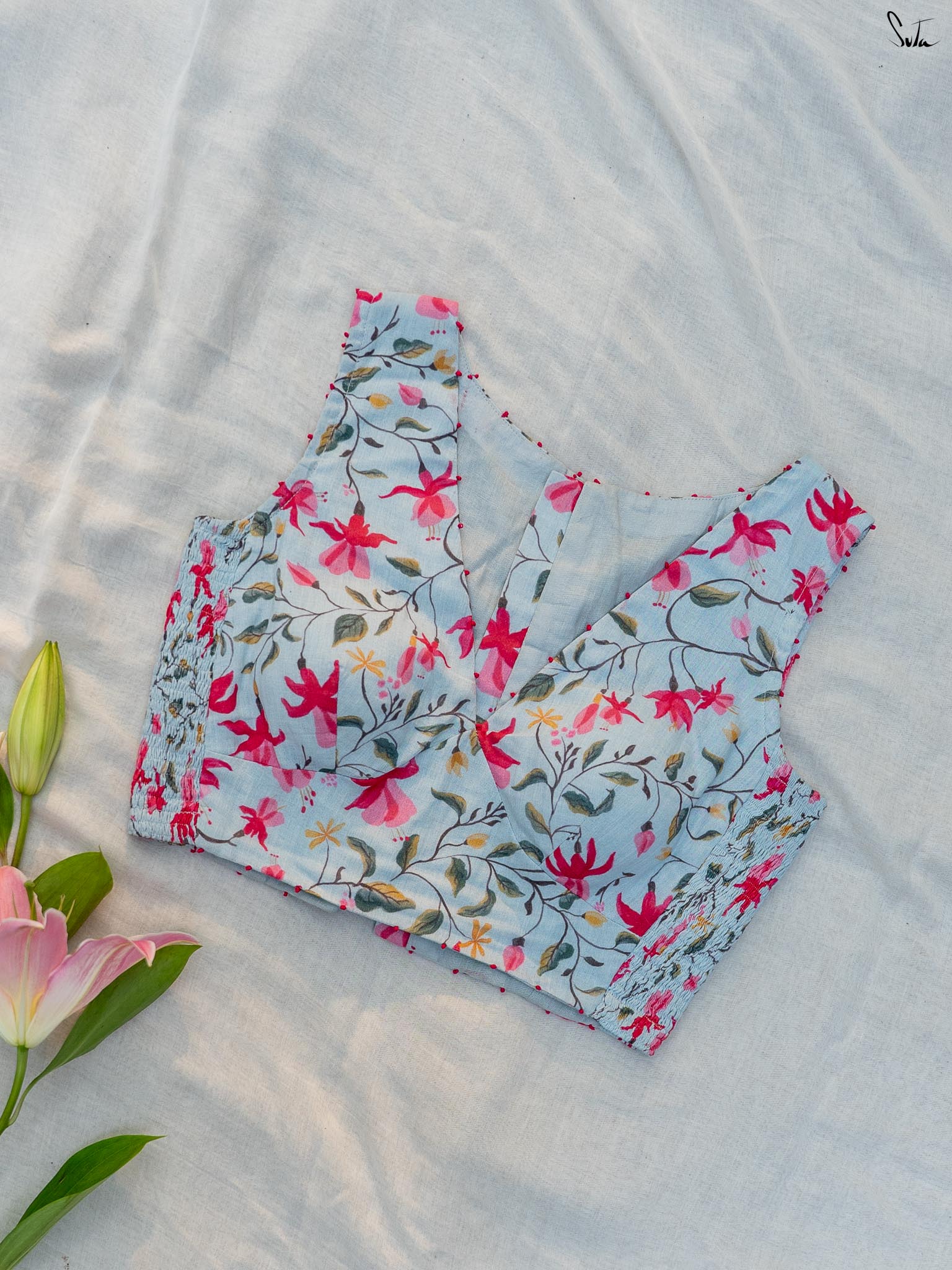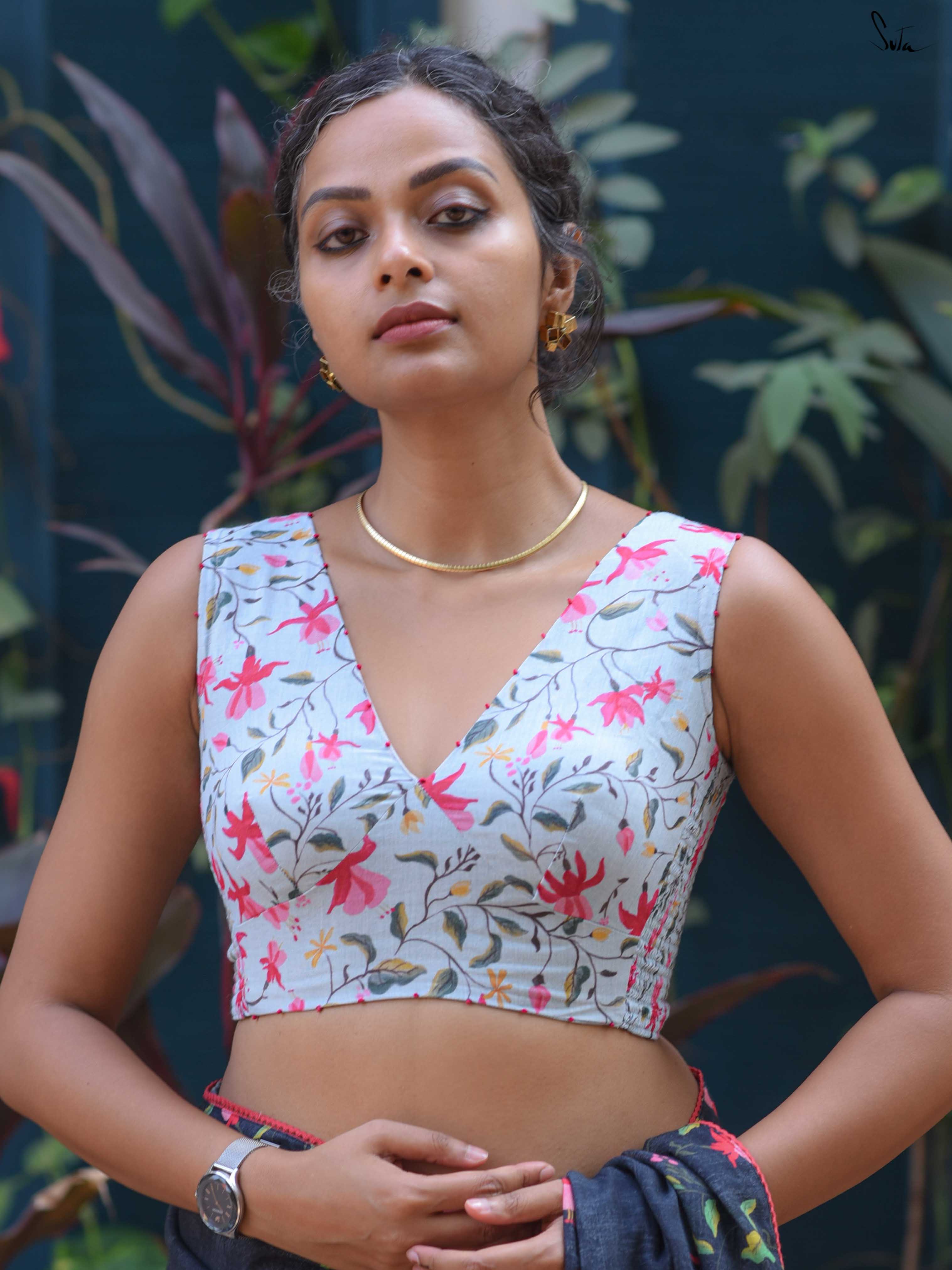 It features a blue base with digital floral prints and a flattering V neckline. Red French knot detailing along the neckline adds a subtle contrast and handcrafted touch. The sleeveless silhouette keeps the look light and versatile.