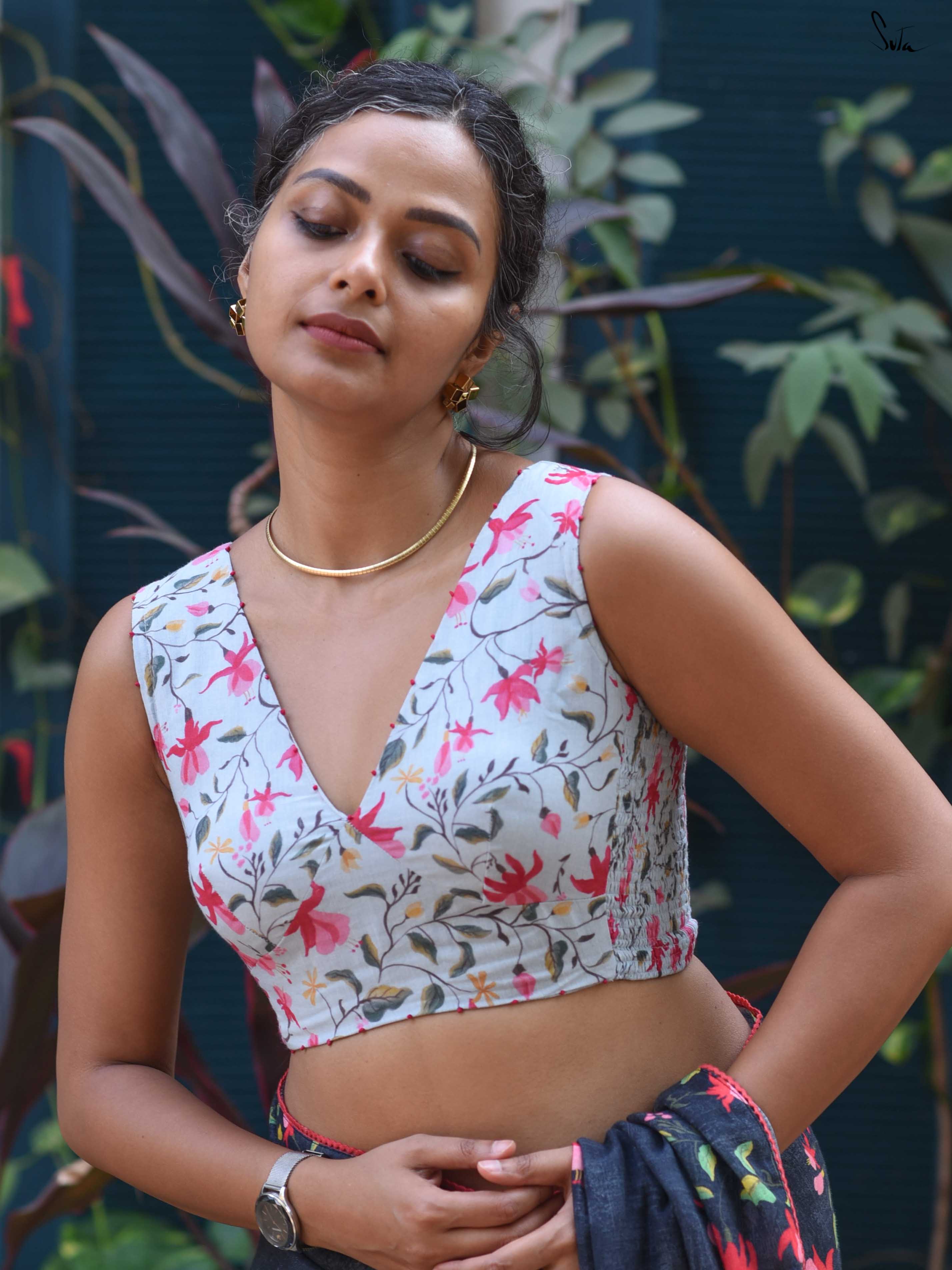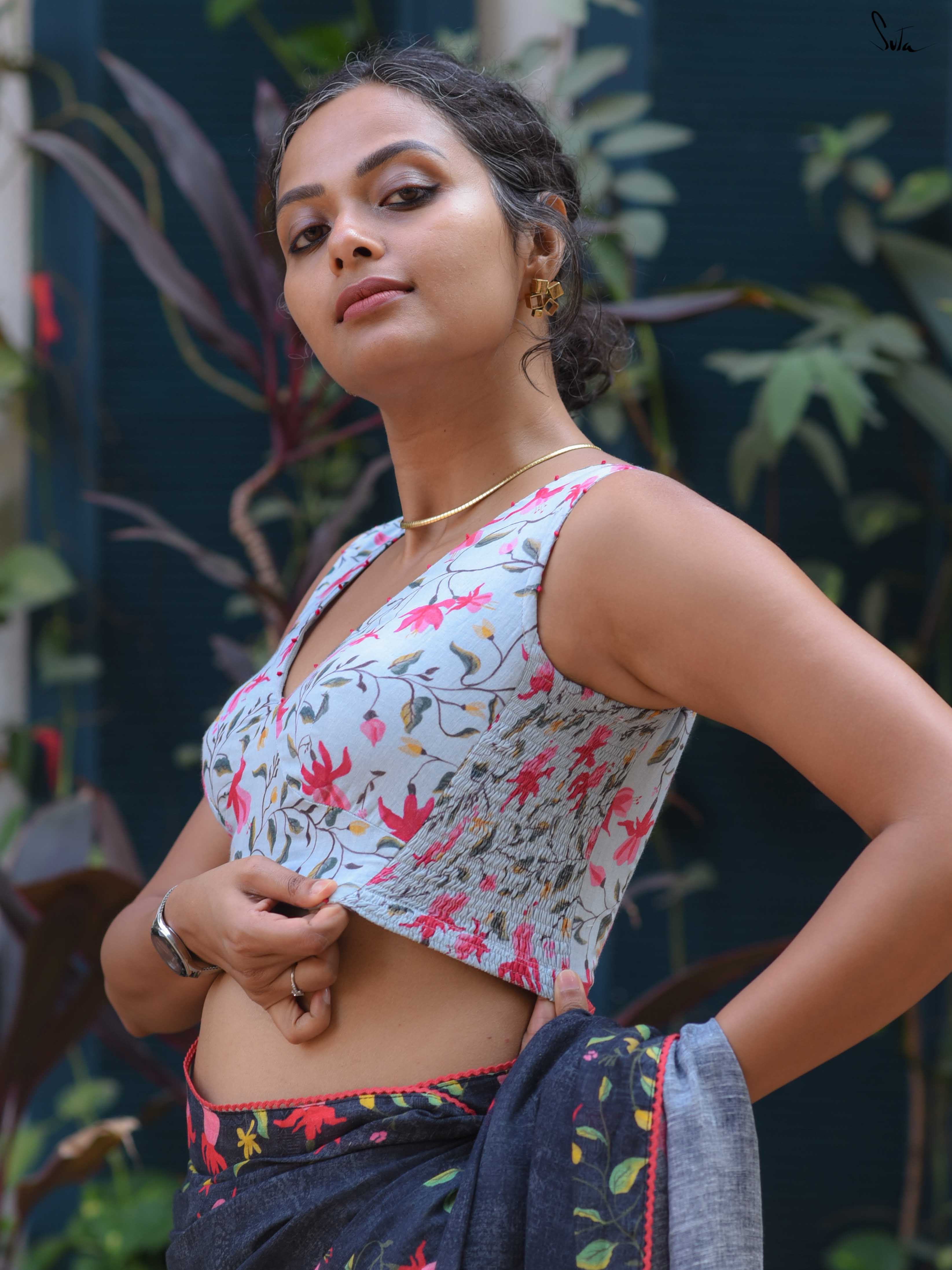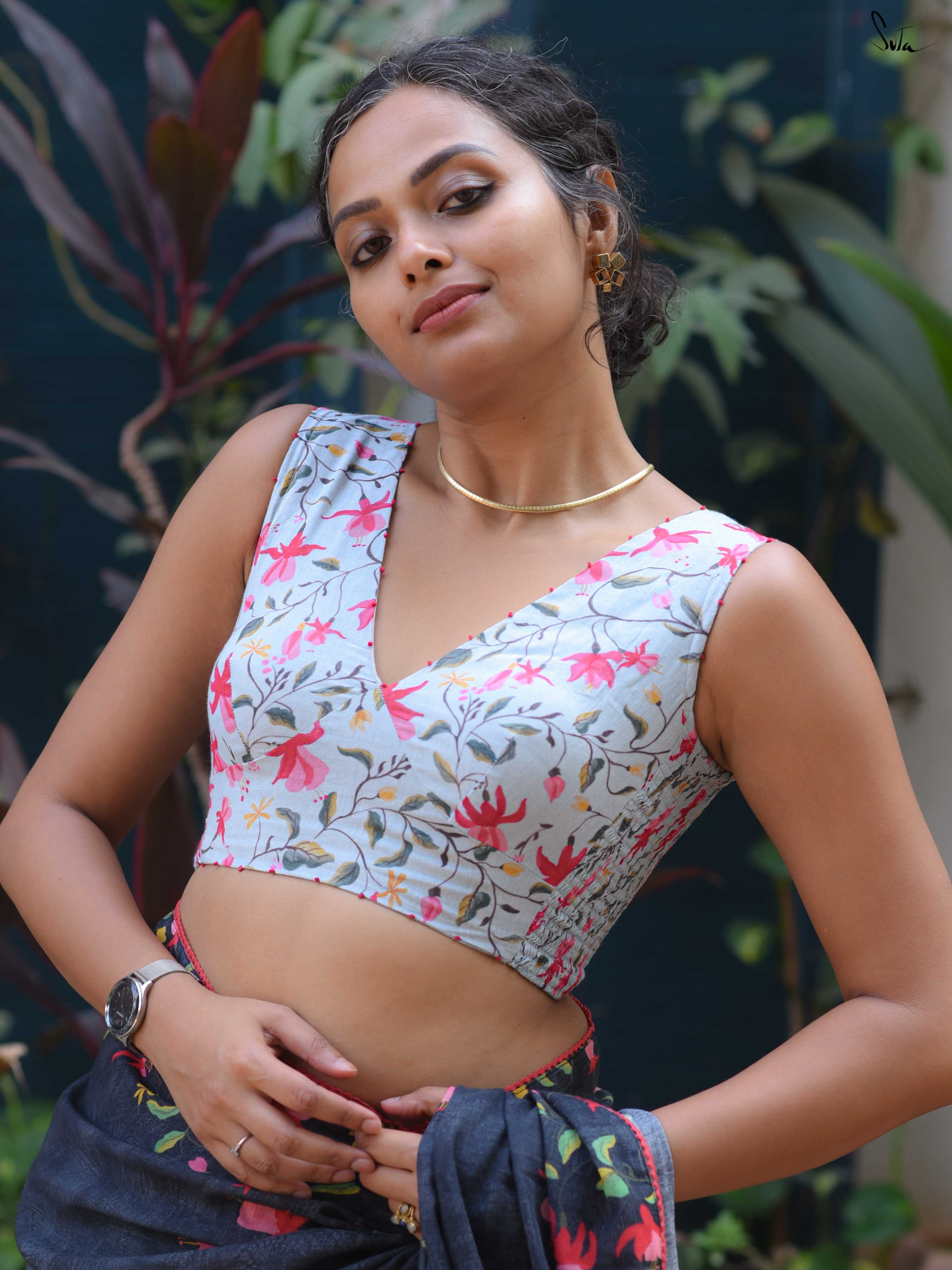 The model is wearing size S blouse and the saree is Blue Fuchsia Fiza.